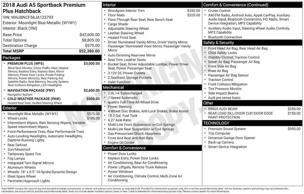 Cold Weather Package (Heated 3-Spoke Steering Wheel w/Shift Paddles and Heated Rear Seats), Convenience Package (Alarm System w/Motion Sensors, Audi Advanced Key, Driver Seat Memory, Heated Auto-Dimming Power/Memory Exterior Mirrors, and SiriusXM All Access Service), Navigation Package (12.3" LCD Display Audi Virtual Cockpit and Audi MMI Navigation Plus w/MMI Touch), Premium Plus (Audi Side Assist, Full LED Headlights, Heated Auto-Dimming Power Ext Mirrors w/Memory, Heated Front Seats, Parking System Plus (Front/Rear Acoustic Sensors), and Rear Audi Pre Sense), quattro, Black Leather, 10 Speakers, 4-Wheel Disc Brakes, ABS brakes, Air Conditioning, All-Weather Floor Mats, Alloy wheels, AM/FM radio, Anti-whiplash front head restraints, Audi Guard Wheel Lock Kit, Audi smartphone interface (Apple CarPlay/Android Auto), Auto-dimming Rear-View mirror, Automatic temperature control, Bang & Olufsen Sound System w/3D Sound, Brake assist, Bumpers: body-color, Cargo Mat, Compass, Delay-off headlights, Driver door bin, Driver vanity mirror, Dual front impact airbags, Dual front side impact airbags, Electronic Stability Control, Exterior Parking Camera Rear, Four wheel independent suspension, Front anti-roll bar, Front Bucket Seats, Front Center Armrest, Front dual zone A/C, Front fog lights, Front reading lights, Garage door transmitter: HomeLink, Gray Oak Wood Natural Inlays, Heated door mirrors, High intensity discharge headlights: Bi-xenon, Illuminated entry, Knee airbag, Leather Seating Surfaces, Leather Shift Knob, Leather steering wheel, Occupant sensing airbag, Outside temperature display, Overhead airbag, Overhead console, Panic alarm, Passenger door bin, Passenger vanity mirror, Power adjustable front head restraints, Power door mirrors, Power driver seat, Power Liftgate, Power moonroof, Power passenger seat, Power steering, Power windows, Radio data system, Radio: Audi Sound System, Rain sensing wipers, Rear air conditioning, Rear anti-roll bar, Rear Load Sill/Door Cup/Door Edge Paint Protection, Rear reading lights, Rear seat center armrest, Rear window defroster, Remote keyless entry, Rings Audi Beam, Speed control, Speed-sensing steering, Speed-Sensitive Wipers, Split folding rear seat, Steering wheel mounted audio controls, Tachometer, Telescoping steering wheel, Tilt steering wheel, Traction control, Trip computer, Turn signal indicator mirrors, Variably intermittent wipers, and Wheels: 18" x 8.5" 10-Spoke-Dynamic-Design. Recent Arrival! 24/34 City/Highway MPG