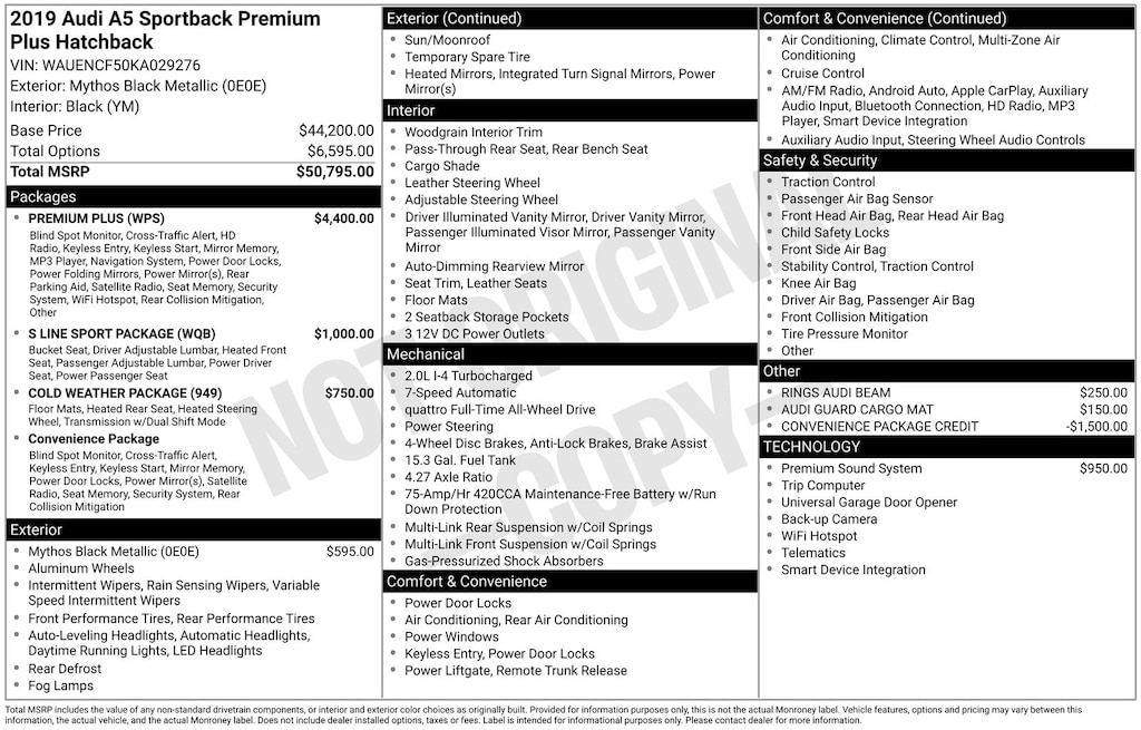 Black Metallic 2019 Audi A5 Sportback Premium Plus quattro quattro 7-Speed Automatic S tronic 2.0L 4-Cylinder TFSI Alarm System w/Motion Sensors, All Weather Floor Mats, Aluminum Trimaran Inlays, Audi Advanced Key, Audi MMI Navigation Plus w/MMI Touch, Audi pre sense rear, Audi Side Assist, Auto-Dimming Exterior Mirrors, Cold Weather Package, Convenience Package, Driver Seat Memory, Heated 3-Spoke Steering Wheel w/Shift Paddles, Heated Front Sport Seats (WQB), Heated Rear Seats, Parking System Plus (Front/Rear Acoustic Sensors), Power Folding Exterior Mirrors, Premium Plus, Rear Seat USB Charge Ports, S Line Bumpers, S Line Fender Badges, S line Side Sill Blades, S line Sport Package, SiriusXM All Access Service, Wheels: 18" x 8.5" 5-Arm-Star Design.