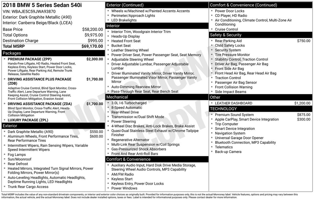 Dark Graphite 2018 BMW 5 Series 540i RWD 8-Speed Automatic 3.0L I6 Turbocharged DOHC 24V LEV3-ULEV70 335hp Canberra Beige/Black Canberra Beg/Blk Dak Cont Stic.