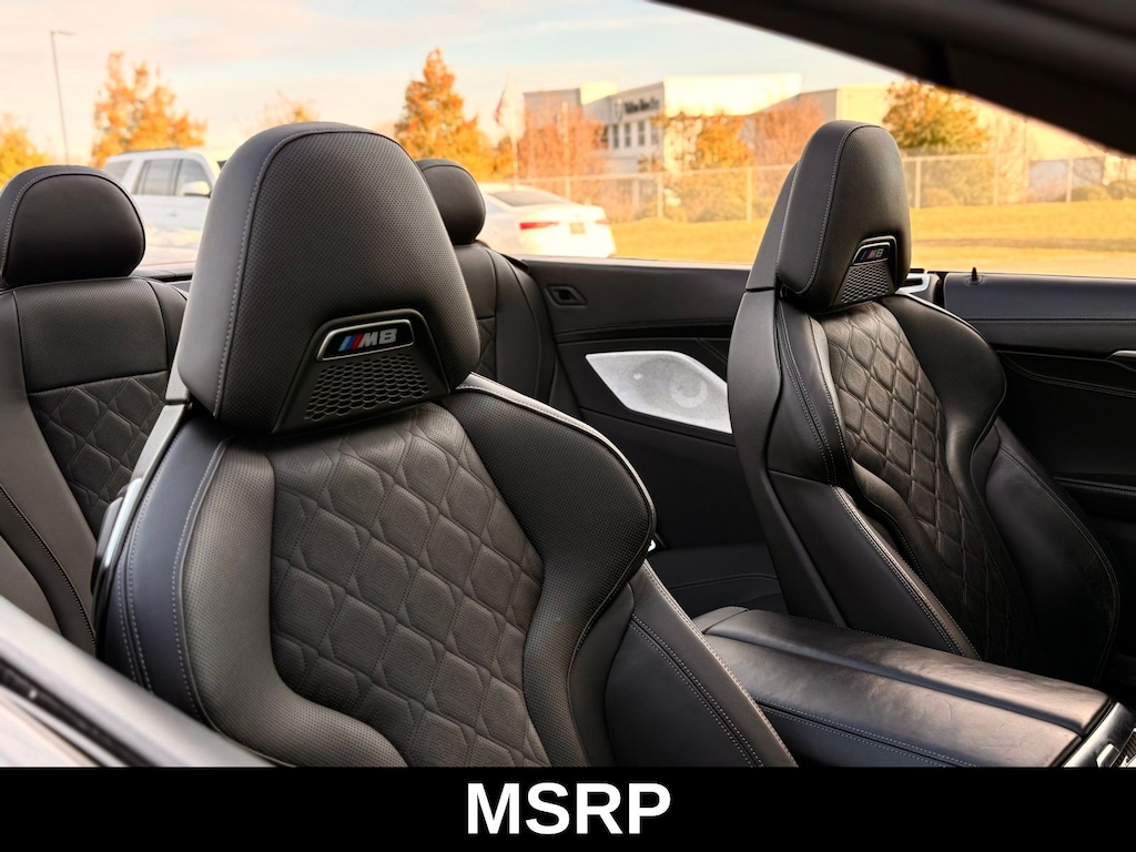 Connected Package Pro, Driving Assistance Package (Active Blind Spot Detection, Active Driving Assistant, Active Park Distance Control, Drive Recorder, Lane Departure Warning System, Parking Assistant Plus, Rear-View Camera, and Surround View w/3D View), Driving Assistance Professional Package (Active Driving Assistant Pro and Extended Traffic Jam Assistant), M Carbon Exterior Package, M Driver's Package, 16 Speakers, 4-Wheel Disc Brakes, ABS brakes, Adaptive suspension, Air Conditioning, Alloy wheels, AM/FM radio: SiriusXM with 360L, Apple CarPlay & Android Auto Compatibility, Apple CarPlay Compatibility, Auto High-beam Headlights, Auto tilt-away steering wheel, Auto-dimming door mirrors, Auto-dimming Rear-View mirror, Automatic temperature control, BMW Assist eCall, BMW TeleServices, Bowers & Wilkins Diamond Surround Sound System, Brake assist, Bumpers: body-color, ConnectedDrive Services, Convertible roof lining, Convertible roof wind blocker, Delay-off headlights, Door auto-latch, Driver door bin, Driver vanity mirror, Dual front impact airbags, Dual front side impact airbags, Electronic Stability Control, Emergency communication system: BMW Assist eCall, Extended Merino Leather, Exterior Parking Camera Rear, Four wheel independent suspension, Front anti-roll bar, Front Bucket Seats, Front Center Armrest, Front dual zone A/C, Front reading lights, Front Ventilated Seats, Fully automatic headlights, Garage door transmitter, Glass rear window, harman/kardon Surround Sound System, harman/kardon® Speakers, Heads-Up Display, Heated door mirrors, Heated front seats, Heated Front Seats w/Armrests & Steering Wheel, Heated steering wheel, Illuminated entry, Integrated roll-over protection, Leather Shift Knob, Leather steering wheel, Live Cockpit Pro w/Navi, Low tire pressure warning, M Compound Brakes w/Red Calipers, Memory seat, Navigation System, Neck Warmer, Occupant sensing airbag, Outside temperature display, Panic alarm, Passenger door bin, Passenger vanity mirror, Power convertible roof, Power door mirrors, Power driver seat, Power passenger seat, Power steering, Power windows, Radio data system, Radio: AM/FM Audio System, Rain sensing wipers, Rear anti-roll bar, Rear window defroster, Remote keyless entry, Security system, SiriusXM w/360L, Speed control, Speed-sensing steering, Speed-Sensitive Wipers, Split folding rear seat, Spoiler, Sport steering wheel, Steering wheel memory, Steering wheel mounted audio controls, Tachometer, Telescoping steering wheel, Tilt steering wheel, Traction control, Trip computer, Turn signal indicator mirrors, Variably intermittent wipers, Ventilated front seats, Wheels: 20" x 9.5" Fr & 20" x 10.5" Rr Bi-Color, Wheels: 20" x 9.5" Fr & 20" x 10.5" Rr M Star-Spoke, WiFi Hotspot, and Wireless Charging. Recent Arrival!