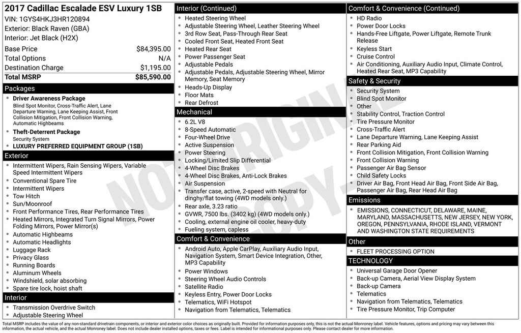 Driver Awareness Package (Forward Collision Alert, IntelliBeam Headlamps, Lane Change Alert, Lane Keep Assist w/Lane Departure Warning, Low Speed Forward Automatic Braking, Rear Cross-Traffic Alert, and Side Blind Zone Alert), Preferred Equipment Group 1SB (Power Tilt-Sliding Sunroof w/Express-Open/Close, Rear Camera Mirror, Rear Camera Washer, Reconfigurable 4-Color Head-Up Display, and Second Row Bucket Seats), Theft-Deterrent Package (Inclination Sensor, Theft-Deterrent Alarm System, and Vehicle Interior Movement Sensor), 4WD, 16 Speakers, 3.23 Axle Ratio, 3rd row seats: split-bench, 4-Wheel Disc Brakes, ABS brakes, Adaptive suspension, Adjustable pedals, Air Conditioning, Alloy wheels, AM/FM radio: SiriusXM, Apple CarPlay, Auto High-beam Headlights, Auto tilt-away steering wheel, Auto-dimming door mirrors, Auto-leveling suspension, Automatic temperature control, Bodyside moldings, Bose Centerpoint Surround Sound System, Brake assist, Bumpers: body-color, CD player, Compass, Delay-off headlights, Driver door bin, Driver vanity mirror, Dual front impact airbags, Dual front side impact airbags, DVD-Audio, Electronic Stability Control, Emergency communication system: OnStar Protection, Exterior Parking Camera Rear, Front anti-roll bar, Front Bucket Seats, Front Center Armrest w/Storage, Front dual zone A/C, Front reading lights, Front wheel independent suspension, Fully automatic headlights, Garage door transmitter, HD Radio, Heads-Up Display, Heated & Cooled Front Bucket Seats, Heated door mirrors, Heated front seats, Heated rear seats, Heated steering wheel, Illuminated entry, Leather Seating Surfaces, Leather Shift Knob, Leather steering wheel, Low tire pressure warning, Magnetic Ride Control Suspension, Memory seat, Navigation System, NavTraffic, Occupant sensing airbag, Outside temperature display, Overhead airbag, Overhead console, Panic alarm, Passenger door bin, Passenger vanity mirror, Pedal memory, Power door mirrors, Power driver seat, Power Liftgate, Power moonroof, Power passenger seat, Power steering, Power windows, Radio data system, Radio: Cadillac CUE Info/Media Ctrl Sys w/Embd Nav, Rain sensing wipers, Rear air conditioning, Rear anti-roll bar, Rear audio controls, Rear reading lights, Rear window defroster, Rear window wiper, Remote keyless entry, Roof rack: rails only, Security system, Single Slot CD/MP3 Player, SiriusXM Satellite Radio, Speed control, Split folding rear seat, Spoiler, Steering wheel memory, Steering wheel mounted audio controls, Tachometer, Telescoping steering wheel, Tilt steering wheel, Traction control, Trip computer, Turn signal indicator mirrors, Variably intermittent wipers, Ventilated front seats, and Wheels: 22" x 9" 7-Spoke Aluminum. Recent Arrival!