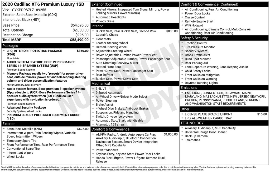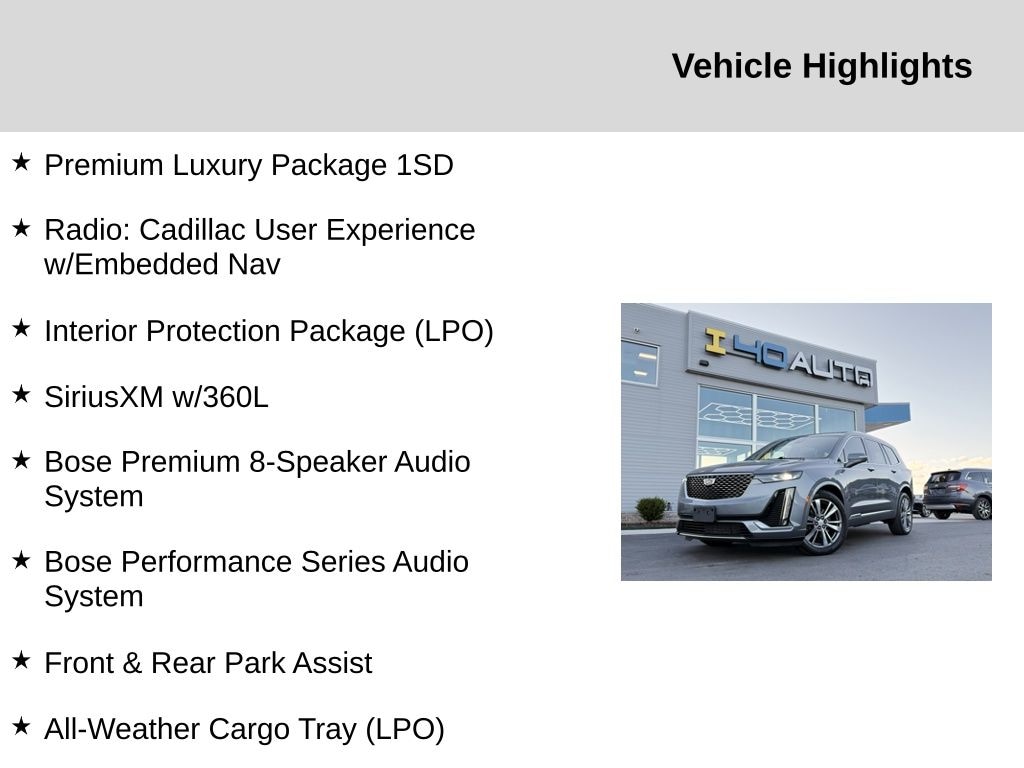 Interior Protection Package (LPO) (All-Weather Cargo Tray (LPO) and All-Weather Floor Mats), Premium Luxury Package 1SD (Automatic Emergency Braking, Bose Premium 8-Speaker Audio System, Front & Rear Park Assist, and Teen Driver), Radio: Cadillac User Experience w/Embedded Nav (Bose Performance Series Audio System and SiriusXM w/360L), 2-Way Power Driver Lumbar Control Seat Adjuster, 2-Way Power Passenger Lumbar Control Seat Adjuster, 3.49 Axle Ratio, 3rd row seats: split-bench, 4-Wheel Disc Brakes, 6-Passenger Seating, 8 Speakers, ABS brakes, Air Conditioning, Alloy wheels, AM/FM radio: SiriusXM, AppLink/Apple CarPlay and Android Auto, Audio memory, Auto High-beam Headlights, Auto tilt-away steering wheel, Auto-dimming door mirrors, Auto-dimming Rear-View mirror, Automatic Stop/Start w/Disable, Automatic temperature control, Brake assist, Bumpers: body-color, Compass, Delay-off headlights, Driver & Front Passenger Heated Seats, Driver door bin, Driver vanity mirror, Dual front impact airbags, Dual front side impact airbags, Electronic Stability Control, Emergency communication system: OnStar and Cadillac connected services capable, Exterior Parking Camera Rear, Four wheel independent suspension, Front anti-roll bar, Front Bucket Seats, Front Center Armrest, Front dual zone A/C, Front License Plate Bracket, Front reading lights, Fully automatic headlights, Garage door transmitter, Heated door mirrors, Heated front seats, Heated steering wheel, Illuminated entry, Knee airbag, Leather Seating Surfaces w/Mini-Perforated Inserts, Leather steering wheel, Low tire pressure warning, Memory seat, Occupant sensing airbag, Outside temperature display, Overhead airbag, Overhead console, Panic alarm, Passenger door bin, Passenger vanity mirror, Power door mirrors, Power driver seat, Power Liftgate, Power moonroof: UltraView, Power passenger seat, Power steering, Power windows, Radio data system, Radio: Cadillac User Experience AM/FM Stereo, Rain sensing wipers, Rear air conditioning, Rear anti-roll bar, Rear reading lights, Rear seat center armrest, Rear window defroster, Rear window wiper, Remote keyless entry, Ride & Handling Suspension, Roof rack: rails only, Security system, Speed control, Speed-sensing steering, Split folding rear seat, Spoiler, Steering wheel memory, Steering wheel mounted audio controls, Tachometer, Telescoping steering wheel, Tilt steering wheel, Traction control, Trip computer, Turn signal indicator mirrors, Variably intermittent wipers, Voltmeter, and Wheels: 20" 6-Split Spoke Alloy. Recent Arrival!