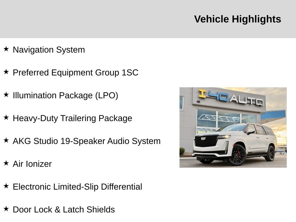 Heavy-Duty Trailering Package (2-Speed Active Transfer Case, Extra Capacity Cooling System, Trailer Tire Pressure Monitoring System, Trailering Assist Guidelines, and Wired Auxiliary Trailer Camera (LPO)), Illumination Package (LPO) (Illuminated Cargo Sill Plate (LPO), Illuminated Front Door Sill Plates (LPO), and Puddle Lamps w/Cadillac Crest (LPO)), Preferred Equipment Group 1SC (Air Ionizer, AKG Studio 19-Speaker Audio System, Automatic Emergency Braking, Body-Color Door Handles, Door Lock & Latch Shields, Electronic Cruise Control w/Set & Resume Speed, Electronic Limited-Slip Differential, Enhanced Automatic Parking Assist, Glass Breakage Sensor, Hitch Guidance w/Hitch View, In-Vehicle Trailering System App, Integrated Trailer Brake Controller, Lane Keep Assist w/Lane Departure Warning, Power Panoramic Tilt-Sliding Sunroof, Rear Camera Mirror, Rear Camera Mirror Washer, Rear Cross Traffic Alert, Reconfigurable Full-Color Head-Up Display, Running Board Assist Steps, Theft-Deterrent Alarm System, Trailer Side Blind Zone Alert, Vehicle Inclination Sensor, and Vehicle Interior Movement Sensor), 4WD, Brandy With Very Dark Atmosphere Accents Leather, 16.9" Diagonal OLED Infotainment Screen, 19 Speakers, 2-Presets Memory For Driver Seat Adjuster, 3.23 Axle Ratio, 3rd row seats: split-bench, 4-Way Power Driver Lumbar Seat Adjuster, 4-Way Power Front Passenger Lumbar Seat Adjuster, 4-Wheel Disc Brakes, 8-Way Power Driver Seat Adjuster, 8-Way Power Front Passenger Seat Adjuster, ABS brakes, Adaptive suspension, Air Conditioning, Alloy wheels, AM/FM radio: SiriusXM with 360L, Apple CarPlay/Android Auto, Audio memory, Auto High-beam Headlights, Auto tilt-away steering wheel, Auto-dimming door mirrors, Auto-dimming Rear-View mirror, Automatic temperature control, Brake assist, Bumpers: body-color, Compass, Delay-off headlights, Driver door bin, Driver vanity mirror, Dual front impact airbags, Dual front side impact airbags, Electronic Stability Control, Emergency communication system: OnStar and Cadillac connected services capable, Four wheel independent suspension, Front anti-roll bar, Front Bucket Seats, Front Center Armrest w/Storage, Front dual zone A/C, Front reading lights, Fully automatic headlights, Garage door transmitter, HD Radio, Heads-Up Display, Heated & Ventilated Driver & Front Passenger Seats, Heated door mirrors, Heated Driver & Front Passenger Seats, Heated front seats, Heated rear seats, Heated steering wheel, Illuminated entry, Leather Seating Surfaces w/Precision Perf Inserts, Leather steering wheel, Low tire pressure warning, Magnetic Ride Control Suspension, Memory seat, Monochrome Cadillac Emblems (LPO), Navigation System, Not Equipped w/Automatic Stop/Start, Not Equipped w/Steering Column Lock, Occupant sensing airbag, Outside temperature display, Overhead airbag, Overhead console, Panic alarm, Passenger door bin, Passenger vanity mirror, Power door mirrors, Power driver seat, Power Liftgate, Power moonroof, Power passenger seat, Power steering, Power windows, Radio data system, Radio: AM/FM/SiriusXM w/Navigation, Rain sensing wipers, Rear air conditioning, Rear anti-roll bar, Rear reading lights, Rear Seat Entertainment System, Rear window defroster, Rear window wiper, Remote keyless entry, Roof rack: rails only, Security system, SiriusXM w/360L, Speed control, Split folding rear seat, Spoiler, Steering wheel memory, Steering wheel mounted audio controls, Tachometer, Teen Driver, Telescoping steering wheel, Tilt steering wheel, Traction control, Trip computer, Turn signal indicator mirrors, Variably intermittent wipers, Ventilated front seats, Voltmeter, Wheels: 22" 12-Spoke Polished Alloy, and Wireless Apple CarPlay/Wireless Android Auto. Recent Arrival!