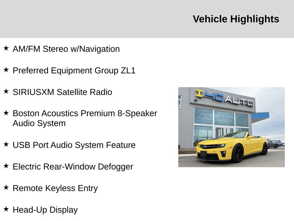 Preferred Equipment Group ZL1 (2 Front Cup Holders, 3-Spoke Leather-Wrapped Steering Wheel, Analog Instrumentation, Boston Acoustics Premium 8-Speaker Audio System, Carpeted Front Floor Mats, Electric Rear-Window Defogger, Electronic Cruise Control, Head-Up Display, Heated Driver & Front Passenger Seats, High-Intensity Discharge Headlamps, LATCH System, Leather-Wrapped Shift Knob, Maintenance-Free Battery, Manual Rake & Telescopic Steering Column, OnStar 6 Months Directions & Connections Plan, Power Programmable Door Locks, Remote Keyless Entry, SIRIUSXM Satellite Radio, StabiliTrak, Steering Wheel Mounted Audio Controls, Tonneau Cover, Ultrasonic Rear Park Assist, Universal Home Remote, and USB Port Audio System Feature), 20" x 10" Fr & 20" x 11" Rr 10-Spoke Wheels, 3.23 Axle Ratio, 4-Wheel Disc Brakes, 8 Speakers, ABS brakes, Air Conditioning, Alloy wheels, AM/FM radio: SiriusXM, AM/FM Stereo w/Navigation, Auto-dimming door mirrors, Auto-dimming Rear-View mirror, Brake assist, Bumpers: body-color, Compass, Convertible roof lining, Delay-off headlights, Driver door bin, Driver vanity mirror, Dual front impact airbags, Dual front side impact airbags, Electronic Stability Control, Emergency communication system: OnStar Directions & Connections, Four wheel independent suspension, Front anti-roll bar, Front Bucket Seats, Front Center Armrest, Front fog lights, Front License Plate Bracket, Front reading lights, Front Sport Bucket Seats, Fully automatic headlights, Garage door transmitter, Glass rear window, Heads-Up Display, Heated door mirrors, Heated front seats, High-Intensity Discharge Headlights, Hood Insert w/Exposed Carbon Fiber Weave, Illuminated entry, Leather Appointed Seating Surfaces, Leather Shift Knob, Low tire pressure warning, Occupant sensing airbag, Outside temperature display, Panic alarm, Passenger door bin, Passenger vanity mirror, Power convertible roof, Power door mirrors, Power driver seat, Power passenger seat, Power steering, Power windows, Radio data system, Radio: AM/FM Stereo w/Color Touch, Rear anti-roll bar, Rear window defroster, Remote keyless entry, Remote Vehicle Starter System, Security system, Speed control, Speed-sensing steering, Spoiler, Steering wheel mounted audio controls, Tachometer, Telescoping steering wheel, Tilt steering wheel, Traction control, Trip computer, Variably intermittent wipers, and Voltmeter. Recent Arrival!