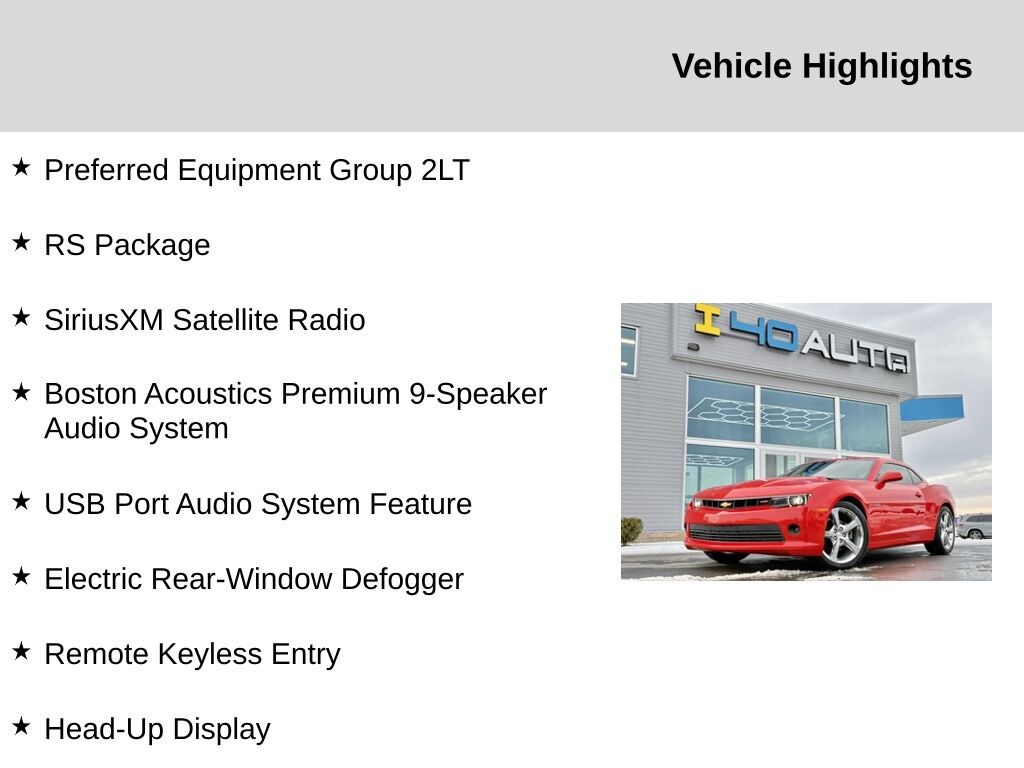 Preferred Equipment Group 2LT (2 Front Cup Holders, 3-Spoke Leather-Wrapped Steering Wheel, 4-Wheel Antilock 4-Wheel Disc Brakes, Analog Instrumentation, Auxiliary Multi-Function Gauges, Boston Acoustics Premium 9-Speaker Audio System, Carpeted Front Floor Mats, Color Display Driver Information Center, Electric Rear-Window Defogger, Electronic Cruise Control, Head-Up Display, Heated Driver & Front Passenger Seats, LATCH System, Leather-Wrapped Shift Knob, Maintenance-Free Battery, Manual Rake & Telescopic Steering Column, OnStar 6 Months Directions & Connections Plan, Power Programmable Door Locks, Remote Keyless Entry, SiriusXM Satellite Radio, StabiliTrak, Stainless-Steel Dual-Outlet Exhaust, Steering Wheel Mounted Audio Controls, Tire Sealant & Inflator Kit, Universal Home Remote, and USB Port Audio System Feature), RS Package (Body-Color Roof Ditch Molding, High-Intensity Discharge Headlamps, and Separate Daytime Running Lamps), 19" Painted Aluminum Wheels, 20" x 8" Front & 20" x 9" Rear Polished Alum Wheels, 4-Wheel Disc Brakes, 6-Way Power Driver Adjuster w/Power Recline, 6-Way Power Fr Passenger Adjuster w/Power Recline, 9 Speakers, ABS brakes, Air Conditioning, Alloy wheels, AM/FM radio: SiriusXM, Auto-dimming door mirrors, Auto-dimming Rear-View mirror, Brake assist, Bumpers: body-color, Compass, Delay-off headlights, Driver door bin, Driver vanity mirror, Dual front impact airbags, Dual front side impact airbags, Electronic Stability Control, Emergency communication system: OnStar Directions & Connections, Exterior Parking Camera Rear, Four wheel independent suspension, Front anti-roll bar, Front Bucket Seats, Front Center Armrest, Front fog lights, Front Leather Seating Surfaces, Front License Plate Bracket, Front reading lights, Front Sport Bucket Seats, Fully automatic headlights, Garage door transmitter, Heads-Up Display, Heated door mirrors, Heated front seats, Illuminated entry, Leather Shift Knob, Low tire pressure warning, Occupant sensing airbag, Outside temperature display, Overhead airbag, Panic alarm, Passenger door bin, Passenger vanity mirror, Power door mirrors, Power driver seat, Power passenger seat, Power steering, Power windows, Premium audio system: Chevrolet MyLink, Radio data system, Radio: AM/FM Stereo w/Color Touch, Rear anti-roll bar, Rear Parking Sensors, Rear Spoiler, Rear window defroster, Remote keyless entry, Remote Vehicle Starter System, Security system, Speed control, Speed-sensing steering, Steering wheel mounted audio controls, Tachometer, Telescoping steering wheel, Tilt steering wheel, Traction control, Trip computer, Variably intermittent wipers, and Voltmeter. Recent Arrival! 19/30 City/Highway MPG