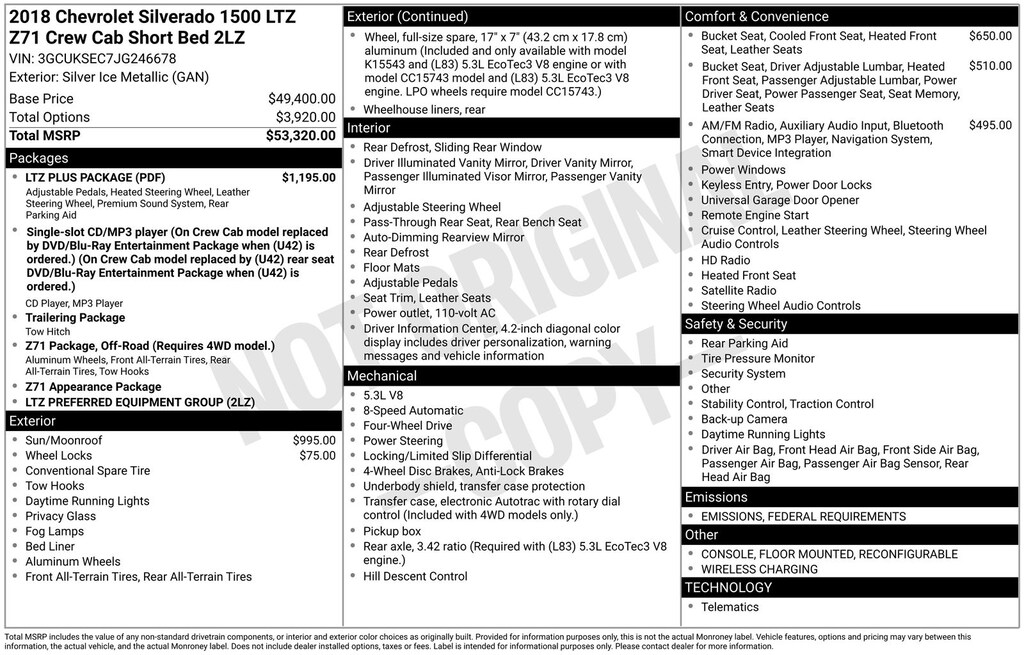 LTZ Plus Package (Leather Wrapped Heated Steering Wheel and Power Adjustable Pedals), Trailering Package, 8-Speed Automatic with Overdrive, 4WD, Jet Black Leather, 110-Volt AC Power Outlet, 150 Amp Alternator, 3.42 Rear Axle Ratio, 4-Wheel Disc Brakes, 4.2" Diagonal Color Display Driver Info Center, 40/20/40 Front Split Bench Seat, 6 Speaker Audio System, 6 Speakers, ABS brakes, Air Conditioning, Alloy wheels, AM/FM radio: SiriusXM, Auto-dimming door mirrors, Auto-Dimming Inside Rear-View Mirror, Auto-dimming Rear-View mirror, Automatic temperature control, Auxiliary External Transmission Oil Cooler, Bluetooth® For Phone, Bodyside moldings, Bose Speaker System, Brake assist, CD player, Chevrolet Connected Access, Chevrolet w/4G LTE, Chrome Bodyside Moldings, Chrome Cap Power-Adjustable Heated Outside Mirrors, Chrome Door Handles, Chrome Mirror Caps, Color-Keyed Carpeting w/Rubberized Vinyl Floor Mats, Compass, Deep-Tinted Glass, Delay-off headlights, Driver & Front Passenger Illuminated Vanity Mirrors, Driver door bin, Driver vanity mirror, Dual front impact airbags, Dual front side impact airbags, Dual-Zone Automatic Climate Control, Electric Rear-Window Defogger, Electronic Stability Control, Exterior Parking Camera Rear, EZ Lift & Lower Tailgate, Floor Mounted Console, Front anti-roll bar, Front Center Armrest w/Storage, Front Chrome Bumper, Front dual zone A/C, Front fog lights, Front Frame-Mounted Black Recovery Hooks, Front Full Feature Power Reclining Bucket Seats, Front reading lights, Front wheel independent suspension, Fully automatic headlights, Garage door transmitter, HD Radio, Heated & Vented Front Seating, Heated door mirrors, Heated Driver & Front Passenger Seats, Heated front seats, Heavy-Duty Rear Locking Differential, Illuminated entry, Leather Appointed Seat Trim, Leather Wrapped Steering Wheel w/Cruise Controls, LED Taillamps w/Signature, Low tire pressure warning, Manual Tilt/Telescoping Steering Column, Memory seat, Occupant sensing airbag, OnStar & Chevrolet Connected Services Capable, Outside temperature display, Overhead airbag, Overhead console, Panic alarm, Passenger door bin, Passenger vanity mirror, Power door mirrors, Power driver seat, Power passenger seat, Power Sliding Rear Window, Power steering, Power Sunroof, Power windows, Power Windows w/Driver Express Up, Premium audio system: Chevrolet MyLink, Radio data system, Radio: AM/FM 8" Diagonal Clr Touch Nav, Radio: AM/FM 8" Diagonal Color Touch Screen, Rear 60/40 Folding Bench Seat (Folds Up), Rear Chrome Bumper, Rear reading lights, Rear seat center armrest, Rear step bumper, Rear Wheelhouse Liners, Rear window defroster, Remote Keyless Entry, Remote keyless entry, Remote Locking Tailgate, Remote Vehicle Starter System, Security system, Single Slot CD/MP3 Player, SiriusXM Satellite Radio, Speed control, Speed-sensing steering, Split folding rear seat, Spray-On Pickup Box Bed Liner, Steering Wheel Audio Controls, Steering wheel mounted audio controls, Tachometer, Telescoping steering wheel, Theft Deterrent System (Unauthorized Entry), Thin Profile LED Fog Lamps, Tilt steering wheel, Traction control, Trip computer, Turn signal indicator mirrors, Ultrasonic Front & Rear Park Assist, Universal Home Remote, Variably intermittent wipers, Voltmeter, Wheel Locks (Set of 4) (LPO), and Wireless Charging. Recent Arrival!