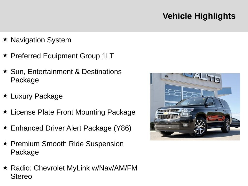 Enhanced Driver Alert Package (Y86) (Forward Collision Alert, IntelliBeam Headlamps, Lane Keep Assist w/Lane Departure Warning, and Low Speed Forward Automatic Braking), License Plate Front Mounting Package, Luxury Package (2nd Row Pwr Release 60/40 Split Folding Bench Seat, 3rd Row 60/40 Power Fold Split-Bench, Extended-Range Remote Keyless Entry, Fog Lamps, Front & Rear Park Assist, Hands Free Power Liftgate, Heated 2nd Row Seats, Heated Leather Wrapped Steering Wheel, Lane Change Alert w/Side Blind Zone Alert, Memory Settings, Passive Entry System, Power Tilt & Telescopic Steering Column w/Memory, Power-Folding Heated Outside Mirrors, Push Button Keyless Start, and Rear Cross-Traffic Alert), Preferred Equipment Group 1LT (1st & 2nd Row Color-Keyed Carpeted Floor Mats, 2nd Row 60/40 Split-Folding Manual Bench, 3rd Row Manual 60/40 Split-Folding Fold Flat Bench, 4-Wheel Antilock Disc Brakes w/Brake Assist, 5 12-Volt Auxiliary Power Outlets, Auto-Dimming Inside Rear-View Mirror, Black Assist Steps, Bose Premium 9-Speaker System, Cargo Net, Color-Keyed Carpeting Floor Covering, Driver Inboard & Front Passenger Airbags, Electronic Cruise Control w/Set & Resume Speed, Floor Console, Front Passenger 6-Way Power Seat Adjuster, Leather-Wrapped Steering Wheel, OnStar Basic Plan For 5 Years, Power Liftgate, Power-Adjustable Accelerator & Brake Pedals, Rear Park Assist w/Audible Warning, Remote Vehicle Start, Roof-Mounted Luggage Rack Side Rails, SiriusXM Satellite Radio, and Universal Home Remote), Premium Smooth Ride Suspension Package, Sun, Entertainment & Destinations Package (Bluetooth® For Phone, HD Radio, Power Sunroof, Radio: Chevrolet MyLink w/Nav/AM/FM Stereo, Rear Seat Blu-Ray/DVD Entertainment System, Single-Slot CD/MP3 Player, and SiriusXM NavTraffic), 4WD, Jet Black/Dark Ash Leather, 18" x 8.5" Aluminum Wheels, 3.08 Rear Axle Ratio, 3rd row seats: split-bench, 4-Wheel Disc Brakes, 9 Speakers, ABS brakes, Adjustable pedals, Air Conditioning, Alloy wheels, AM/FM radio: SiriusXM, Apple CarPlay/Android Auto, Auto High-beam Headlights, Auto-dimming Rear-View mirror, Automatic temperature control, Brake assist, Bumpers: body-color, CD player, Compass, Delay-off headlights, Driver door bin, Driver vanity mirror, Dual front impact airbags, Dual front side impact airbags, Electronic Stability Control, Emergency communication system: OnStar Guidance, Exterior Parking Camera Rear, Front anti-roll bar, Front Bucket Seats, Front Center Armrest, Front dual zone A/C, Front Heated Reclining Bucket Seats, Front reading lights, Front wheel independent suspension, Fully automatic headlights, Garage door transmitter, Heated door mirrors, Heated front seats, Illuminated entry, Leather-Appointed Seat Trim, Low tire pressure warning, Memory seat, Occupant sensing airbag, Outside temperature display, Overhead airbag, Overhead console, Panic alarm, Passenger door bin, Passenger vanity mirror, Pedal memory, Power door mirrors, Power driver seat, Power passenger seat, Power steering, Power windows, Premium audio system: Chevrolet MyLink, Radio: Chevrolet MyLink AM/FM Stereo, Rain sensing wipers, Rear air conditioning, Rear anti-roll bar, Rear reading lights, Rear seat center armrest, Rear window defroster, Rear window wiper, Remote keyless entry, Roof rack: rails only, Security system, Speed control, Speed-sensing steering, Split folding rear seat, Spoiler, Steering wheel mounted audio controls, Tachometer, Telescoping steering wheel, Tilt steering wheel, Traction control, Trip computer, Variably intermittent wipers, and Voltmeter. Odometer is 11427 miles below market average!