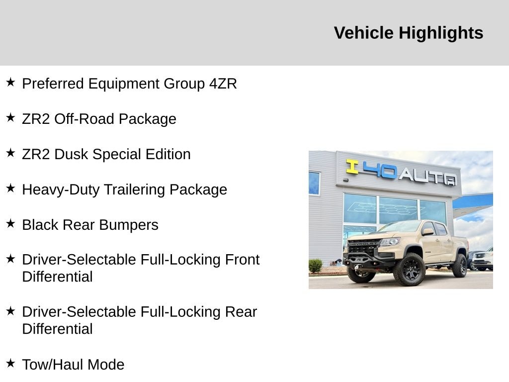 Heavy-Duty Trailering Package, Preferred Equipment Group 4ZR (Black Rear Bumpers, Black Spray-On Bedliner w/Chevrolet Logo, Driver-Selectable Full-Locking Front Differential, Driver-Selectable Full-Locking Rear Differential, Hitch Guidance, Integrated Trailer Brake Controller, and Tow/Haul Mode), ZR2 Dusk Special Edition (Off-Road Lights (LPO), Off-Road Sport Bar (LPO) (SCU), and Wheels: 17" x 8" Gloss Black Aluminum), ZR2 Off-Road Package, 4WD, 3.42 Rear Axle Ratio, 4-Way Power Front Passenger Seat Adjuster, 4-Wheel Disc Brakes, 6 Speakers, 6-Speaker Audio System Feature, ABS brakes, Air Conditioning, Alloy wheels, AM/FM radio: SiriusXM, Apple CarPlay/Android Auto, Auto-dimming Rear-View mirror, Automatic temperature control, Black Colorado Emblems (LPO), Black Tailgate CHEVROLET Lettering (LPO), Compass, Delay-off headlights, Driver 6-Way Power Seat Adjuster, Driver door bin, Driver vanity mirror, Dual front impact airbags, Dual front side impact airbags, Electronic Stability Control, Exterior Parking Camera Rear, Front anti-roll bar, Front Bucket Seats, Front Center Armrest, Front License Plate Kit, Front reading lights, Front wheel independent suspension, Fully automatic headlights, HD Radio, Heated door mirrors, Heated Driver & Front Passenger Seats, Heated front seats, Heated steering wheel, Illuminated entry, Leather-Appointed Seat Trim, Low tire pressure warning, Occupant sensing airbag, Outside temperature display, Overhead airbag, Overhead console, Panic alarm, Passenger door bin, Passenger vanity mirror, Power door mirrors, Power Driver Lumbar Control Seat Adjuster, Power driver seat, Power Passenger Lumbar Control Seat Adjuster, Power passenger seat, Power steering, Power windows, Premium audio system: Chevrolet Infotainment 3 Plus, Radio data system, Radio: Chevrolet Infotainment 3 Plus System, Rear reading lights, Rear seat center armrest, Rear step bumper, Rear window defroster, Remote keyless entry, Security system, SiriusXM Radio, Speed control, Speed-sensing steering, Steering wheel mounted audio controls, Tachometer, Telescoping steering wheel, Tilt steering wheel, Traction control, Trip computer, Variably intermittent wipers, and Wheels: 17" x 8" Graphite & Oxide Gold Aluminum. Recent Arrival!