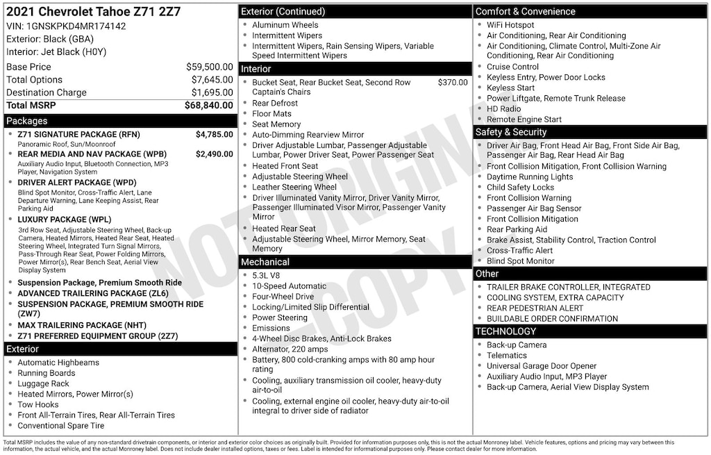 Black 2021 Chevrolet Tahoe Z71 4WD 10-Speed Automatic with Overdrive EcoTec3 5.3L V8 4WD, Black Leather.