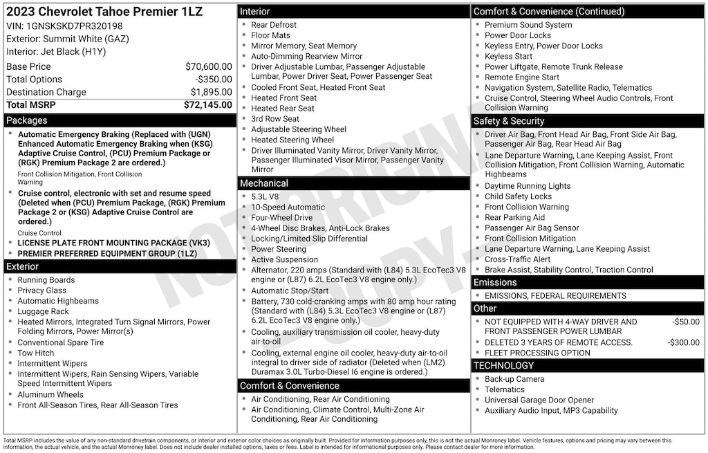 License Plate Front Mounting Package, Preferred Equipment Group 1LZ (1st & 2nd Row Color-Keyed Carpeted Floor Mats, 2-Speed Active Electronic AutoTrac Transfer Case, 3rd Row 60/40 Power-Folding Split-Bench Seat, Auto-Dimming Inside Rear-View Mirror, Bose 10-Speaker Centerpoint Surround Audio Sys Ft, Bright Front & Rear Door Sill Plates, Chrome Door Handles w/Body-Color Strip, Chrome Mirror Caps, Color-Keyed Carpeting Floor Covering, Driver & Front Outboard Passenger Airbags, Dual Exhaust System, Enhanced Driver Information Center, Floor Console, Hands-Free Rear Power Programmable Liftgate, Heated 2nd Row Outboard Seats, Heated Steering Wheel, Hill Descent Control, Infotainment Display, Lane Change Alert w/Side Blind Zone Alert, LED Daytime Running Lamps, Memory Settings, Outside Heated Power-Adjustable Mirrors, Power Release 2nd Row Bucket Seats, Power Tilt & Telescopic Steering Column, Rear Cross Traffic Alert, Remote Start, Safety Alert Seat, SiriusXM Radio w/360L, Universal Home Remote, Wireless Charging, and Wrapped Steering Wheel), 4WD, Black Leather, Navigation System, 10 Speakers, 20" x 9" Polished Aluminum Wheels, 3.23 Rear Axle Ratio, 3rd row seats: split-bench, 4-Wheel Disc Brakes, ABS brakes, Adaptive suspension, Air Conditioning, Alloy wheels, AM/FM radio: SiriusXM with 360L, Apple CarPlay/Android Auto, Auto High-beam Headlights, Auto-dimming door mirrors, Auto-dimming Rear-View mirror, Auto-leveling suspension, Automatic temperature control, Brake assist, Bumpers: body-color, Compass, Delay-off headlights, Deleted 3 Years of Remote Access, Driver door bin, Driver vanity mirror, Dual front impact airbags, Dual front side impact airbags, Electronic Stability Control, Emergency communication system: OnStar and Chevrolet connected services capable, Four wheel independent suspension, Front anti-roll bar, Front Bucket Seats, Front Center Armrest, Front dual zone A/C, Front High-Back Reclining Bucket Seats, Front reading lights, Fully automatic headlights, Garage door transmitter, Heated & Ventilated Driver & Front Passenger Seats, Heated door mirrors, Heated Driver & Front Passenger Seats, Heated front seats, Heated rear seats, Heated steering wheel, Illuminated entry, Low tire pressure warning, Magnetic Ride Control Suspension, Memory seat, Not Equipped w/4-Way Driver & Fr Pass Pwr Lumbar, Occupant sensing airbag, Outside temperature display, Overhead airbag, Overhead console, Panic alarm, Passenger door bin, Passenger vanity mirror, Perforated Leather Seat Trim, Power door mirrors, Power driver seat, Power Liftgate, Power passenger seat, Power steering, Power windows, Premium audio system: Chevrolet Infotainment 3 Premium, Radio: Chevrolet Infotainment 3 Premium System, Rain sensing wipers, Rear air conditioning, Rear anti-roll bar, Rear reading light