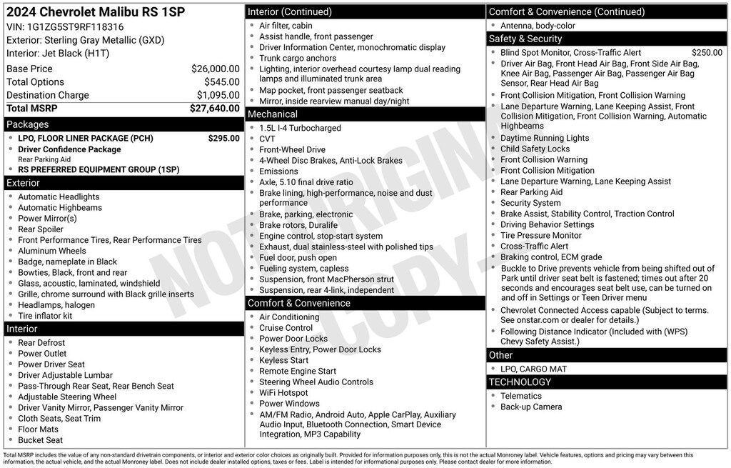 Sterling Gray Metallic 2024 Chevrolet Malibu RS FWD CVT 1.5L DOHC Jet Black Cloth.
