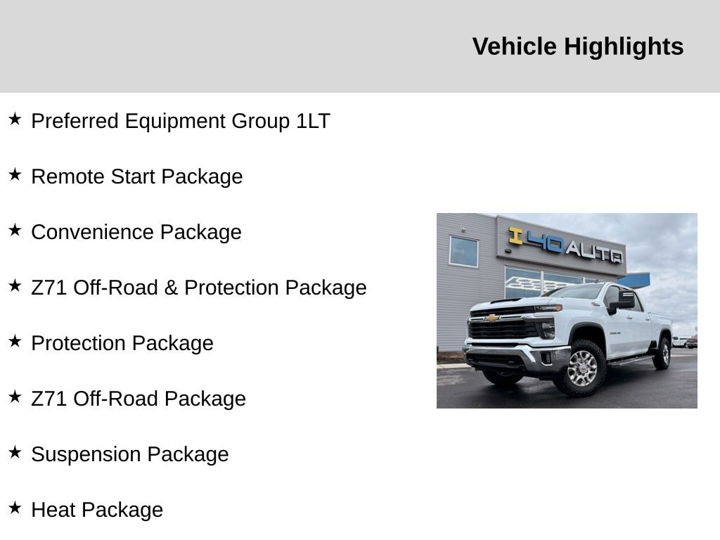 Convenience Package (10-Way Power Driver Seat Adjuster w/Lumbar, 120-Volt Bed Mounted Power Outlet, Dual Rear USB Ports (Charge Only), Dual-Zone Automatic Climate Control, Front LED Fog Lamps, LED Cargo Area Lighting, and Manual Tilt & Telescoping Steering Column), Heat Package (Heated Driver & Front Outboard Passenger Seating and Heated Steering Wheel), Preferred Equipment Group 1LT (170 Amp Alternator, 2-Speed Electronic Shift Transfer Case, 4-Way Manual Driver Seat Adjuster, Black Mirror Caps, Bluetooth® For Phone, Chevrolet Connected Access Capable, Color-Keyed Carpeting Floor Covering, Compass, Deep-Tinted Glass, Electronic Cruise Control w/Set & Resume Speed, EZ Lift Power Lock & Release Tailgate, Front Rubberized Vinyl Floor Mats, Halogen Reflector Headlamps, HD Rear Vision Camera, Heated Vertical Trailering Mirrors, Keyless Open & Start, Manual Tilt-Wheel Steering Column, OnStar & Chevrolet Connected Services Capable, Power Door Locks, Power Front Windows w/Driver Express Up/Down, Power Front Windows w/Passenger Express Down, Power Rear Windows w/Express Down, Push Button Start, Rear 60/40 Folding Bench Seat (Folds Up), Rear Rubberized Vinyl Floor Mats, SiriusXM w/360L, Standard Tailgate, Steering Wheel Audio Controls, Wi-Fi Hotspot Capable, Wireless Phone Projection, and Wrapped Steering Wheel), Protection Package (Black Chevytec Spray-On Bedliner and Rear Wheelhouse Liners), Remote Start Package (Electric Rear-Window Defogger, Remote Vehicle Starter System, and Unauthorized Entry Theft-Deterrent System), Suspension Package, Z71 Off-Road & Protection Package (1st & 2nd Row All-Weather Floor Liners (LPO) (AAK) and Wheels: 18" Machined Alum w/Silver Painted Accents), Z71 Off-Road Package (Hill Descent Control and Off-Road Suspension), 10-Speed Automatic, 4WD, Black Cloth, 120-Volt Interior Power Outlet (DISC), 17" Machined Aluminum Wheels, 4-Wheel Disc Brakes, 6 Speakers, 6-Speaker Audio System, 6" Rectangular Chromed Tubular Assist Steps, 720 Cold-Cranking Amps Heavy-Duty Battery, ABS brakes, Air Conditioning, Alloy wheels, AM/FM radio: SiriusXM with 360L, Apple CarPlay/Android Auto, Auto High-beam Headlights, Brake assist, Bumpers: chrome, Cloth Seat Trim, Delay-off headlights, Driver door bin, Driver vanity mirror, Dual 220-Amp Primary/170-Amp Auxiliary Alternators, Dual front impact airbags, Dual front side impact airbags, Durabed Pickup Bed, Electronic Stability Control, Engine Block Heater, Exhaust Brake, Front 40/20/40 Split-Bench Seats w/Lockable Storage, Front anti-roll bar, Front Center Armrest w/Storage, Front License Plate Kit, Front reading lights, Front wheel independent suspension, Fully automatic headlights, Heated door mirrors, Illuminated entry, Low tire pressure warning, Occupant sensing airbag, Outside temperature display, Overhead airbag, Overhead console, Panic alarm, Passenger door bin, Passenger vanity mirror, Power door mirrors, Power steering, Power windows, Premium audio system: Chevrolet Infotainment 3 Premium, Radio: Chevrolet Infotainment 3 Premium System, Rear reading lights, Rear step bumper, Remote keyless entry, Speed control, Split folding rear seat, Steering wheel mounted audio controls, Tachometer, Tilt steering wheel, Traction control, Trip computer, Turn signal indicator mirrors, Variably intermittent wipers, Voltmeter, and Winter Grille Cover. Recent Arrival!