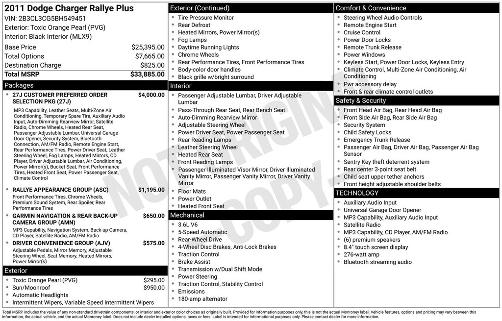 Toxic Orange Pearlcoat 2011 Dodge Charger Rallye Plus RWD 5-Speed Automatic 3.6L V6 24V VVT Black Interior Leather.