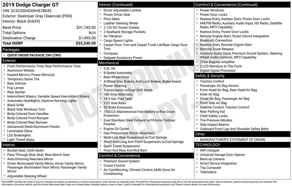 Destroyer Gray Clearcoat 2019 Dodge Charger GT RWD 8-Speed Automatic 3.6L 6-Cylinder SMPI DOHC Black Cloth.