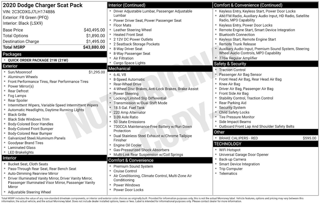 Quick Order Package 21W, Black Cloth, 4-Wheel Disc Brakes, 6 Speakers, ABS brakes, Air Conditioning, Alloy wheels, AM/FM radio: SiriusXM, Anti-whiplash front head restraints, Apple CarPlay/Android Auto, Auto-dimming Rear-View mirror, Automatic temperature control, Brake assist, Brake Calipers - Red, Bumpers: body-color, Cloth Performance Seats w/Bee Logo, Compass, Delay-off headlights, Driver door bin, Driver vanity mirror, Dual front impact airbags, Dual front side impact airbags, Electronic Stability Control, Emergency communication system: SiriusXM Guardian, Four wheel independent suspension, Front anti-roll bar, Front Bucket Seats, Front Center Armrest, Front dual zone A/C, Front fog lights, Front reading lights, Fully automatic headlights, Garage door transmitter: HomeLink, Heated front seats, Illuminated entry, Knee airbag, Leather Shift Knob, Low tire pressure warning, Occupant sensing airbag, Outside temperature display, Overhead airbag, Overhead console, Panic alarm, ParkView Rear Back-Up Camera, Passenger door bin, Passenger vanity mirror, Power door mirrors, Power driver seat, Power Driver/Passenger 4-Way Lumbar Adjust, Power Front Driver/Passenger Seats, Power passenger seat, Power steering, Power Sunroof, Power windows, Radio data system, Radio: Uconnect 4C w/8.4" Display, Rear anti-roll bar, Rear reading lights, Rear seat center armrest, Rear window defroster, Remote keyless entry, Security system, Speed control, Speed-Sensitive Wipers, Split folding rear seat, Spoiler, Sport steering wheel, Steering wheel mounted audio controls, Tachometer, Telescoping steering wheel, Tilt steering wheel, Traction control, Trip computer, Variably intermittent wipers, and Wheels: 20" x 9" Lo Gloss Granite Crystal. Recent Arrival!
