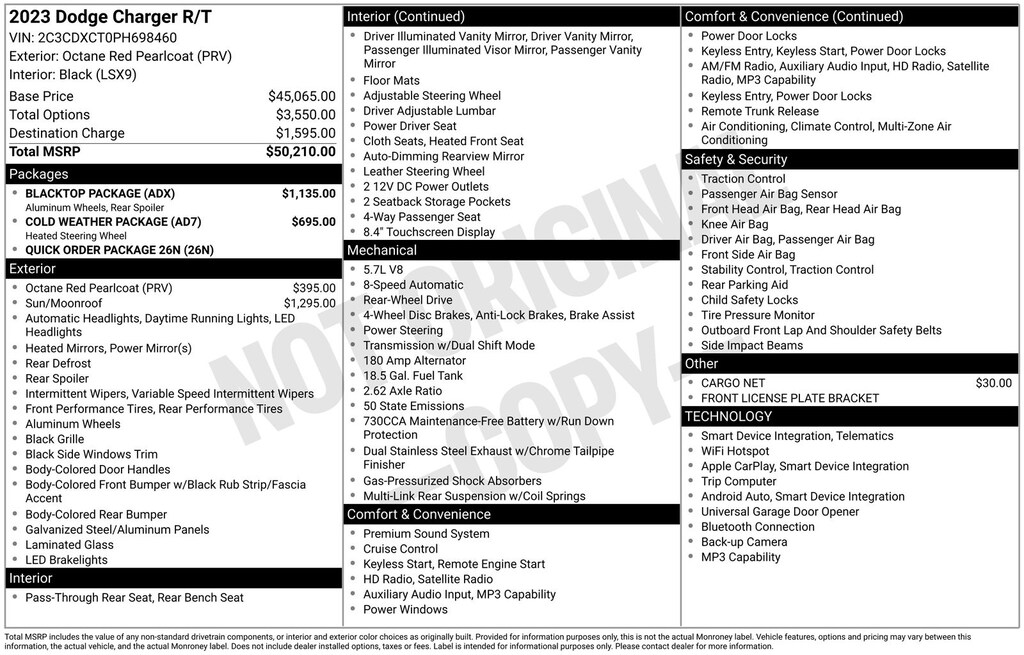 Octane Red Pearlcoat 2023 Dodge Charger R/T RWD 8-Speed Automatic HEMI 5.7L V8 Multi Displacement VVT Black Cloth.