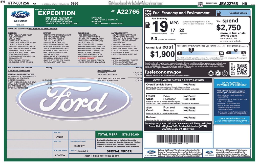 White Gold 2018 Ford Expedition Platinum 4WD 10-Speed Automatic EcoBoost 3.5L V6 GTDi DOHC 24V Twin Turbocharged 4WD, Electronic Limited Slip w/3.73 Axle Ratio, Equipment Group 600A (DISC), Heavy-Duty Engine Radiator, Heavy-Duty Trailer Tow Package, Integrated Trailer Brake Controller, Navigation System, Pro Trailer Backup Assist.