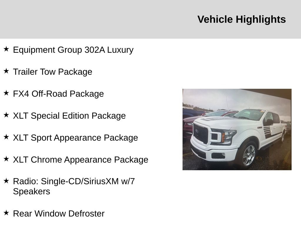 Equipment Group 302A Luxury (10-Way Power Driver & Passenger Seats, 4.2" Productivity Screen in Instrument Cluster, Auto-Dimming Rear-View Mirror, Class IV Trailer Hitch Receiver, Cloth 40/20/40 Front Seat, Fixed Backlight w/Privacy Glass, Heated Front Seats, Leather-Wrapped Steering Wheel, Power Glass Heated Sideview Mirrors, Power-Adjustable Pedals, Radio: Single-CD/SiriusXM w/7 Speakers, Rear Under-Seat Storage, Rear Window Defroster, Remote Start System, Reverse Sensing System, SYNC, and SYNC 3), FX4 Off-Road Package (4x4 FX4 Off-Road Bodyside Decal, Hill Descent Control, and Off-Road Tuned Front Shock Absorbers), Trailer Tow Package (Pro Trailer Backup Assist and Upgraded Front Stabilizer Bar), XLT Chrome Appearance Package (2-Bar Style Grille w/Chrome 2 Minor Bars, Chrome Door & Tailgate Handles w/Body-Color Bezel, Chrome Step Bars, Single-Tip Chrome Exhaust, and Wheels: 18" Chrome-Like PVD), XLT Special Edition Package (Black Running Boards, Body-Color Surround Grille w/Black Mesh Insert, Box Side Decal, Unique Bodyside & Hood Decals, and Wheels: 20" Unique Premium Tarnished Dark Painted), XLT Sport Appearance Package (2-Bar Style Grille w/2 Minor Bars Painted Dark, Accent-Color Step Bars, Body-Color Door & Tailgate Handles, Body-Color Front & Rear Bumpers, Box Side Decals, and Wheels: 18" 6-Spoke Machined-Aluminum), 4WD, 110V/400W Outlet, 3.31 Axle Ratio, 4-Wheel Disc Brakes, 6 Speakers, 8-Way Power Driver Seat, ABS brakes, Air Conditioning, Alloy wheels, AM/FM radio, Brake assist, Bumpers: chrome, CD player, Compass, Delay-off headlights, Driver door bin, Driver vanity mirror, Dual front impact airbags, Dual front side impact airbags, Electronic Stability Control, Emergency communication system: 911 Assist, Exterior Parking Camera Rear, Front anti-roll bar, Front Center Armrest w/Storage, Front fog lights, Front reading lights, Front wheel independent suspension, Fully automatic headlights, Illuminated entry, Low tire pressure warning, Occupant sensing airbag, Outside temperature display, Overhead airbag, Panic alarm, Passenger door bin, Passenger vanity mirror, Power door mirrors, Power steering, Power windows, Power-Sliding Rear Window, Radio data system, Radio: AM/FM Stereo/Single-CD Player, Rear reading lights, Rear step bumper, Remote keyless entry, Security system, Speed control, Speed-sensing steering, Split folding rear seat, Steering wheel mounted audio controls, Tachometer, Tailgate Step w/Tailgate Lift Assist, Telescoping steering wheel, Tilt steering wheel, Traction control, Variably intermittent wipers, Voice-Activated Touchscreen Navigati
