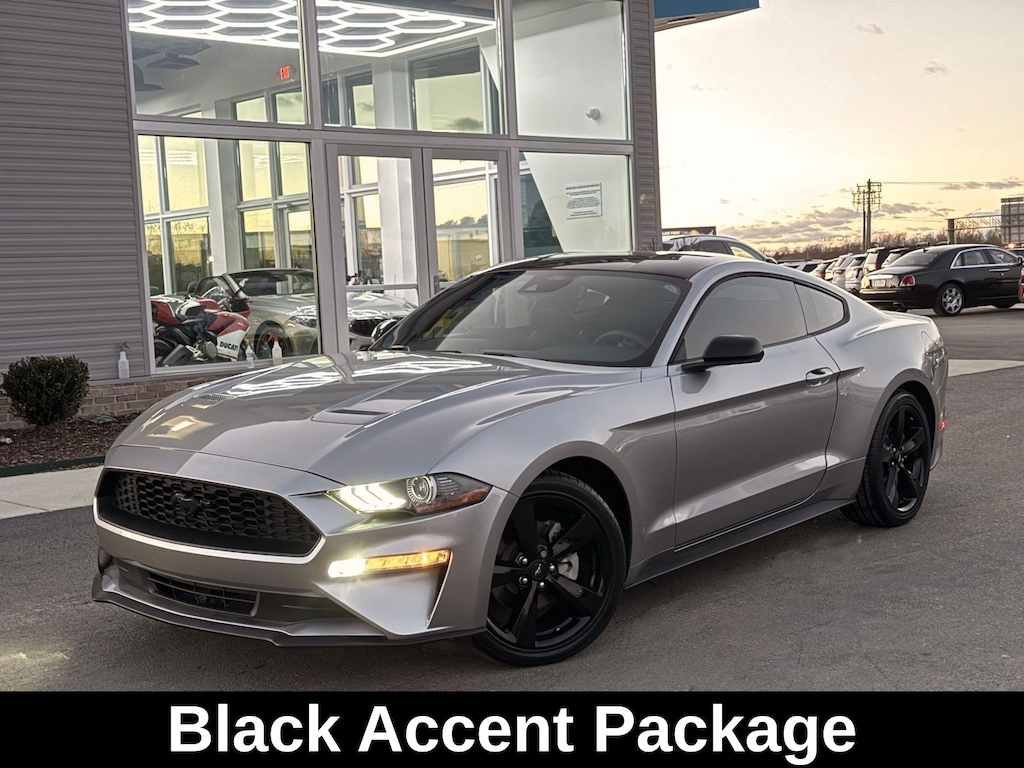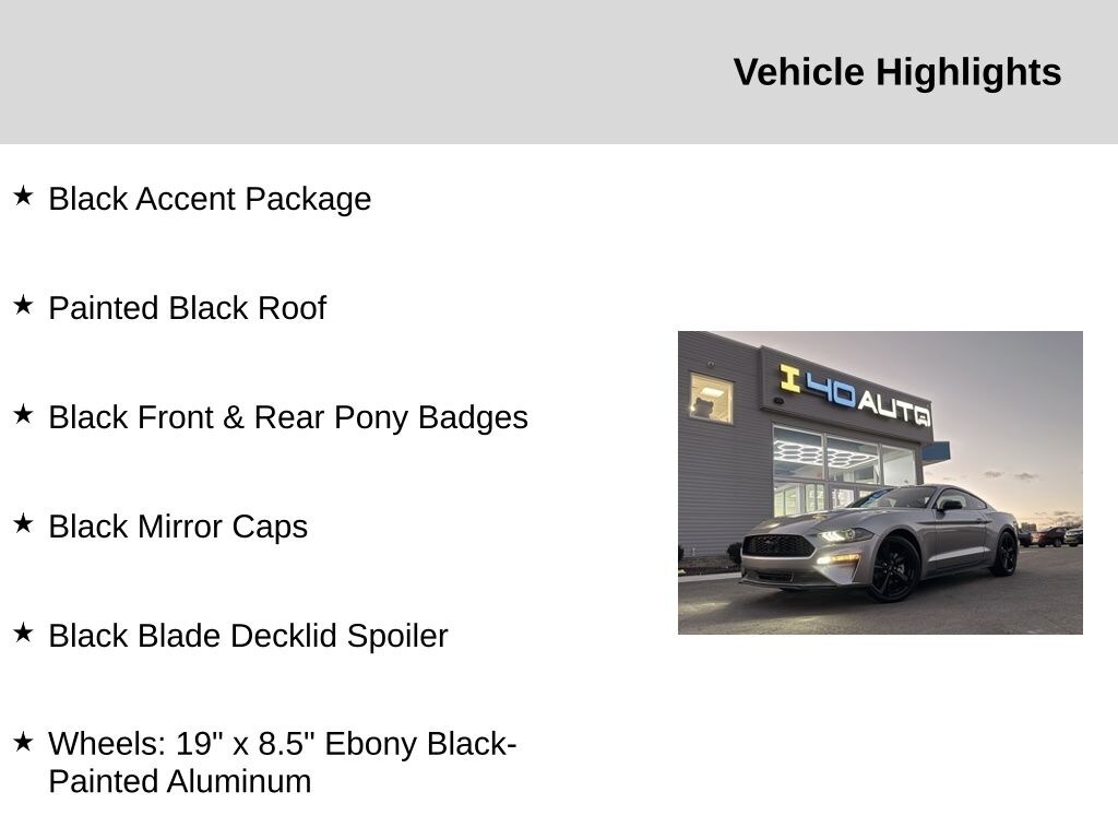 Black Accent Package (Black Front & Rear Pony Badges, Black Mirror Caps, Painted Black Roof, and Wheels: 19" x 8.5" Ebony Black-Painted Aluminum), 4-Wheel Disc Brakes, ABS brakes, Air Conditioning, Alloy wheels, AM/FM Stereo, Auto High-beam Headlights, Auto-dimming Rear-View mirror, Brake assist, Bumpers: body-color, Compass, Delay-off headlights, Driver door bin, Driver vanity mirror, Dual front impact airbags, Dual front side impact airbags, Electronic Stability Control, Emergency communication system: 911 Assist, Exterior Parking Camera Rear, Four wheel independent suspension, Front anti-roll bar, Front Bucket Seats, Front Center Armrest, Front reading lights, Fully automatic headlights, Illuminated entry, Knee airbag, Leather Shift Knob, Low tire pressure warning, Occupant sensing airbag, Outside temperature display, Overhead airbag, Overhead console, Panic alarm, Passenger door bin, Passenger vanity mirror, Power door mirrors, Power steering, Power windows, Radio data system, Rain sensing wipers, Rear anti-roll bar, Rear window defroster, Remote keyless entry, Security system, SiriusXM Radio, Speed control, Speed-sensing steering, Speed-Sensitive Wipers, Split folding rear seat, Steering wheel mounted audio controls, SYNC 3 Communications & Entertainment System, Tachometer, Telescoping steering wheel, Tilt steering wheel, Traction control, Trip computer, Variably intermittent wipers, Voltmeter, and Wheels: 18" x 8" Machined-Face Aluminum. Recent Arrival! 21/32 City/Highway MPG