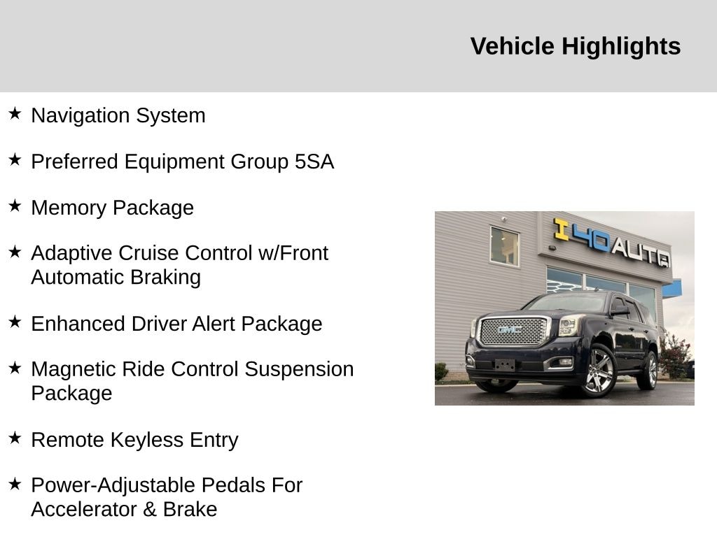 Adaptive Cruise Control w/Front Automatic Braking (4-Wheel Disc & 4-Wheel VAC Power Antilock Brakes and Automatic Collision Preparation), Enhanced Driver Alert Package (Forward Collision Alert Sensor Indicator, Intellibeam Automatic High Beam On/Off Headlamps, Lane Keep Assist, and Low Speed Forward Automatic Braking), Magnetic Ride Control Suspension Package, Memory Package, Preferred Equipment Group 5SA (17" Disc/Disc VAC Power Brakes, 5 Auxiliary 12-volt Power Outlets, Black Assist Steps w/Chrome Strip, Hands Free Power Liftgate, Heated Leather-Wrapped Steering Wheel, Inside Rear-View Auto-Dimming Mirror, Integrated Trailer Brake Controller, OnStar Basic Plan For 5 Years, OnStar w/4G LTE, Passive Entry System, Power Release Second Row Bucket Seats, Power Tilt & Telescopic Steering Column, Power-Adjustable Pedals For Accelerator & Brake, Push Button Keyless Start, Rear Cross-Traffic Alert, Remote Keyless Entry, Side Blind Zone Alert w/Lane Change Alert, Universal Home Remote, and Wireless Charging), 4WD, 10 Speakers, 3.23 Axle Ratio, 3rd row seats: split-bench, 4-Wheel Disc Brakes, ABS brakes, Adaptive suspension, Adjustable pedals, Air Conditioning, Alloy wheels, AM/FM radio: SiriusXM, Apple CarPlay/Android Auto, Auto High-beam Headlights, Auto-dimming door mirrors, Auto-dimming Rear-View mirror, Automatic temperature control, Black Roof Rack Cross Rails, Bodyside moldings, Bose Centerpoint Premium 10-Speaker Surround Sound, Brake assist, Bumpers: body-color, CD Player, CD player, Compass, Delay-off headlights, Driver door bin, Driver vanity mirror, Dual front impact airbags, Dual front side impact airbags, Electronic Stability Control, Emergency communication system: OnStar Guidance, Exterior Parking Camera Rear, Front anti-roll bar, Front Bucket Seats, Front Center Armrest, Front dual zone A/C, Front fog lights, Front reading lights, Front wheel independent suspension, Full-Feature Reclining Bucket Seats, Fully automatic headlights, Garage door transmitter, Genuine wood console insert, Genuine wood dashboard insert, Genuine wood door panel insert, Heads-Up Display, Heated & Ventilated Driver & Front Passenger Seats, Heated door mirrors, Heated front seats, Heated rear seats, Heated steering wheel, High-Intensity Discharge Headlights, Illuminated entry, Leather Shift Knob, Low tire pressure warning, Memory seat, Navigation System, NavTraffic, Occupant sensing airbag, Outside temperature display, Overhead airbag, Overhead console, Panic alarm, Passenger door bin, Passenger vanity mirror, Pedal memory, Perforated Leather-Appointed Seat Trim, Power door mirrors, Power driver seat, Power Liftgate, Power passenger seat, Power steering, Power Tilt-Sliding Sunroof w/Express-Open/Close, Power windows, Premium audio system: IntelliLink, Pwr Retractable Assist Steps w/Perimeter Lighting, Radio: AM/FM/SiriusXM w/Navigation, Rain sensing wipers, Rear air conditioning, Rear anti-roll bar, Rear reading lights, Rear window defroster, Rear window wiper, Remote keyless entry, Roof rack: rails only, Security system, SiriusXM Satellite Radio, Speed control, Speed-sensing steering, Split folding rear seat, Spoiler, Steering wheel memory, Steering wheel mounted audio controls, Tachometer, Telescoping steering wheel, Tilt steering wheel, Traction control, Trip computer, Turn signal indicator mirrors, Variably intermittent wipers, Ventilated front seats, Voltmeter, and Wheels: 20" x 9" Ultra Bright Machined Aluminum. Recent Arrival!