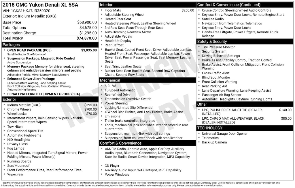Enhanced Driver Alert Package (Forward Collision Alert, IntelliBeam Automatic High Beam On/Off Headlamps, Lane Keep Assist w/Lane Departure Warning, and Low Speed Forward Automatic Braking), Magnetic Ride Control Suspension Package, Memory Package, Open Road Package (3rd Row DVD Screen, Power Tilt-Sliding Sunroof w/Express-Open/Close, and Rear Seat Blu-Ray/DVD Entertainment System), Preferred Equipment Group 5SA (4-Wheel Antilock Disc Brakes, 5 Auxiliary 12-volt Power Outlets, Black Assist Steps w/Chrome Strip, Hands Free Power Liftgate, Heated Leather-Wrapped Steering Wheel, Inside Rear-View Auto-Dimming Mirror, Integrated Trailer Brake Controller, Lane Change Alert w/Side Blind Zone Alert, OnStar 4G LTE, OnStar Basic Plan For 5 Years, Passive Entry System, Power Release Second Row Bucket Seats, Power Tilt & Telescopic Steering Column, Power-Adjustable Pedals For Accelerator & Brake, Push Button Keyless Start, Rear Cross-Traffic Alert, Remote Keyless Entry, Universal Home Remote, and Wireless Charging), Navigation System, 10 Speakers, 1st & 2nd Rows All-Weather Floor Liner (LPO), 3.23 Rear Axle Ratio, 3rd row seats: split-bench, 4-Wheel Disc Brakes, ABS brakes, Adaptive suspension, Adjustable pedals, Air Conditioning, Alloy wheels, AM/FM radio: SiriusXM, Apple CarPlay/Android Auto, Auto High-beam Headlights, Auto-dimming door mirrors, Auto-dimming Rear-View mirror, Automatic temperature control, Black All-Weather Cargo Mat (LPO), Bodyside moldings, Bose Centerpoint Premium 10-Speaker Surround Sound, Brake assist, Bumpers: body-color, CD Player, CD player, Compass, Delay-off headlights, Driver door bin, Driver vanity mirror, Dual front impact airbags, Dual front side impact airbags, Electronic Stability Control, Emergency communication system: OnStar and GMC connected services capable, Exterior Parking Camera Rear, Front anti-roll bar, Front Bucket Seats, Front Center Armrest, Front dual zone A/C, Front fog lights, Front reading lights, Front wheel independent suspension, Full-Feature Reclining Bucket Seats, Fully automatic headlights, Garage door transmitter: HomeLink, Genuine wood console insert, Genuine wood dashboard insert, Genuine wood door panel insert, Heads-Up Display, Heated & Ventilated Driver & Front Passenger Seats, Heated door mirrors, Heated front seats, Heated rear seats, Heated steering wheel, High-Intensity Discharge Headlights, Illuminated entry, Leather Shift Knob, Low tire pressure warning, Memory seat, Occupant sensing airbag, Outside temperature display, Overhead airbag, Overhead console, Panic alarm, Passenger door bin, Passenger vanity mirror, Pedal memory, Perforated Leather-Appointed Seat Trim, Polished Exhaust Tip, Power door mirrors, Power driver seat, Power Liftgate, Power passenger seat, Power steering, Power windows, Premium audio system: IntelliLink, Radio: AM/FM/SiriusXM w/Navigation, Rai