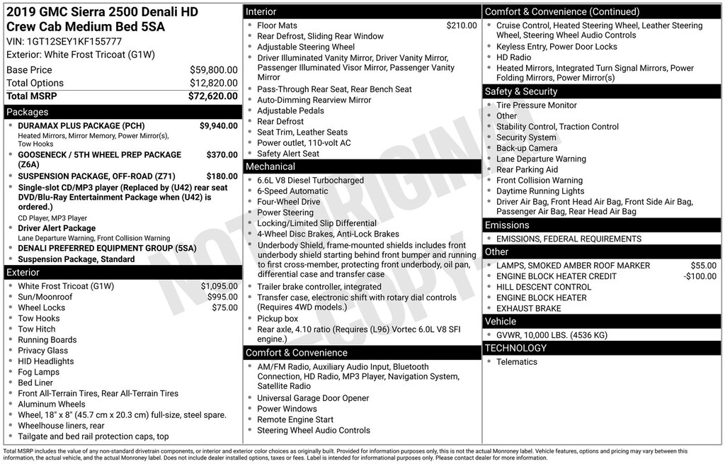 Driver Alert Package (Forward Collision Alert, Lane Departure Warning System, and Ultrasonic Front & Rear Park Assist), Duramax Plus Package (Chrome Power-Adjustable Heated Outside Mirrors and Chrome Recovery Hooks), Gooseneck/5th Wheel Prep Package, Heavy-Duty Handling/Trailering Suspension Package, Off-Road Suspension Package (Hill Descent Control and Z71 Chrome Front Fender Emblems), OnStar & GMC Connected Services Capable (GMC 4G LTE and GMC Connected Access), Preferred Equipment Group 5SA (110-Volt AC Power Outlet, 150 Amps Alternator, 8" Multi-Color Driver Instrument Info Display, Auto-Dimming Inside Rear-View Mirror, Black Frame-Mounted Front Recovery Hooks, Body-Color Front Bumper, Bose 7 Speaker Sound System, Chrome Bodyside Moldings, Chrome Door Handles, Color-Keyed Carpeted Floor Mats, Color-Keyed Carpeting Floor Covering, Deep-Tinted Glass, Driver & Front Passenger Vanity Mirror Visors, Dual-Zone Automatic Climate Control, Electric Rear-Window Defogger, Electronic Shift Transfer Case, Front Halogen Fog Lamps, Heated & Ventilated Front Bucket Seats, Heated Leather Wrapped Steering Wheel, Heated Power-Adjustable Outside Mirrors, Manual Tilt-Wheel/Telescoping Steering Column, Power Sliding Rear Window w/Defogger, Power-Adjustable Pedals For Accelerator & Brake, Rear 60/40 Folding Bench Seat (Folds Up), Rear Body-Color Bumper w/Bumper CornerSteps, Rear Wheelhouse Liners, Remote Keyless Entry, Remote Locking Tailgate, Remote Vehicle Starter System, Steering Wheel Audio Controls, Theft Deterrent System (Unauthorized Entry), and Universal Home Remote), Trailering Equipment (Trailer Brake Controller), Allison 1000 6-Speed Automatic, 4WD, Cocoa/Dark Sand Leather, 4-Wheel Disc Brakes, 7 Speakers, ABS brakes, Adjustable pedals, Air Conditioning, All-Weather Floor Liner (LPO), Alloy wheels, AM/FM radio: SiriusXM, Apple CarPlay/Android Auto, Auto-dimming door mirrors, Auto-dimming Rear-View mirror, Automatic temperature control, Bluetooth® For Phone, Bodyside moldings, Brake assist, Bumpers: body-color, CD player, Chrome wheels, Compass, Delay-off headlights, Driver door bin, Driver vanity mirror, Dual front impact airbags, Dual front side impact airbags, Electronic Stability Control, Engine Block Heater, Exhaust Brake, Exterior Parking Camera Rear, Floor Mounted Console, Front anti-roll bar, Front Bucket Seats, Front Center Armrest, Front dual zone A/C, Front fog lights, Front Full Feature Ventilated Bucket Seats, Front reading lights, Front wheel independent suspension, Fully automatic headlights, Garage door transmitter, HD Radio, Heated door mirrors, Heated Driver and Front Passenger Seats, Heated front seats, Heated steering wheel, High-Intensity Discharge Headlights, Illuminated entry, Low tire pressure warning, Memory seat, Navigation System, Occupant sensing airbag, Outside temperature display, Overhead airbag, Overhead console, Panic alarm, Passenger door bin, Passenger vanity mirror, Perforated Leather Appointed Seat Trim, Power door mirrors, Power driver seat, Power passenger seat, Power steering, Power Sunroof, Power windows, Premium audio system: GMC Infotainment System, Radio: AM/FM/SiriusXM/HD w/Navigation, Rear reading lights, Rear seat center armrest, Rear step bumper, Rear window defroster, Remote keyless entry, Security system, Single Slot CD/MP3 Player, SiriusXM Radio, Smoked Amber Roof Marker Lamps, Speed control, Speed-sensing steering, Split folding rear seat, Steering wheel mounted audio controls, Tachometer, Telescoping steering wheel, Tilt steering wheel, Traction control, Trip computer, Turn signal indicator mirrors, Variably intermittent wipers, Ventilated front seats, Voltmeter, Wheel Locks (Set of 4) (LPO), Wheels: 20" Chrome Cast Aluminum, and Wireless Charging. Recent Arrival!