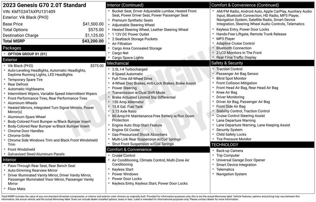 Option Group 01, 4-Wheel Disc Brakes, 6 Speakers, ABS brakes, Air Conditioning, Alloy wheels, AM/FM radio: SiriusXM, Android Auto & Apple CarPlay, Anti-whiplash front head restraints, Auto High-beam Headlights, Auto-dimming Rear-View mirror, Automatic temperature control, Brake assist, Bumpers: body-color, Delay-off headlights, Driver door bin, Driver vanity mirror, Dual front impact airbags, Dual front side impact airbags, Electronic Stability Control, Emergency communication system: Genesis Connected Services, Exterior Parking Camera Rear, Four wheel independent suspension, Front anti-roll bar, Front Bucket Seats, Front Center Armrest, Front dual zone A/C, Front reading lights, Fully automatic headlights, Garage door transmitter: HomeLink, Heated door mirrors, Heated front seats, Heated Multi-Adjustable Front Bucket Seats, Heated steering wheel, Illuminated entry, Knee airbag, Leatherette Seating Surfaces, Low tire pressure warning, Navigation System, Occupant sensing airbag, Outside temperature display, Overhead airbag, Overhead console, Panic alarm, Passenger door bin, Passenger vanity mirror, Power door mirrors, Power driver seat, Power passenger seat, Power steering, Power windows, Radio: AM/FM/SiriusXM/HD Audio System, Rear anti-roll bar, Rear reading lights, Rear seat center armrest, Rear window defroster, Remote keyless entry, Security system, Speed control, Speed-Sensitive Wipers, Split folding rear seat, Steering wheel mounted audio controls, Tachometer, Telescoping steering wheel, Traction control, Trip computer, Turn signal indicator mirrors, Variably intermittent wipers, and Wheels: 19" x 8.0J Fr & 19" x 8.5J Rr Alloy. 20/28 City/Highway MPG