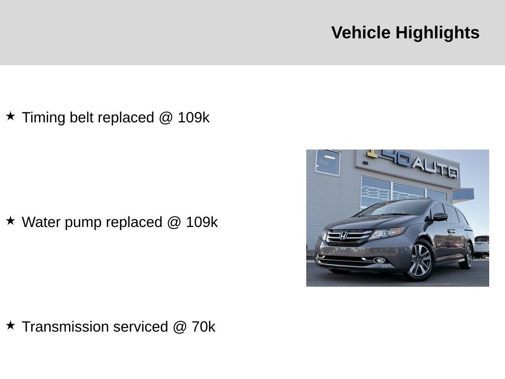 Charcoal 2015 Honda Odyssey EX-L FWD 6-Speed Automatic 3.5L V6 SOHC i-VTEC 24V Timing belt replaced @ 109k, Water pump replaced @ 109k, Transmission serviced @ 70k.