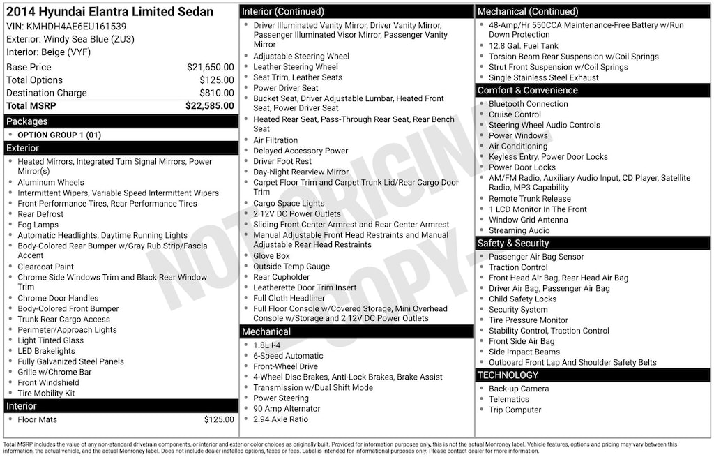 Option Group 1, 17" Alloy Wheels, 4-Wheel Disc Brakes, 6 Speakers, ABS brakes, Air Conditioning, Alloy wheels, AM/FM radio: SiriusXM, Brake assist, Bumpers: body-color, Carpeted Floor Mats, CD player, Delay-off headlights, Driver door bin, Driver vanity mirror, Dual front impact airbags, Dual front side impact airbags, Electronic Stability Control, Emergency communication system: Blue Link, Exterior Parking Camera Rear, Front anti-roll bar, Front Bucket Seats, Front Center Armrest, Front fog lights, Front reading lights, Front wheel independent suspension, Fully automatic headlights, Heated door mirrors, Heated Front Seats, Heated front seats, Heated rear seats, Illuminated entry, Leather Seating Surfaces, Low tire pressure warning, Occupant sensing airbag, Outside temperature display, Overhead airbag, Overhead console, Panic alarm, Passenger door bin, Passenger vanity mirror, Power door mirrors, Power driver seat, Power steering, Power windows, Radio: AM/FM/CD/MP3 w/SiriusXM Satellite, Rear anti-roll bar, Rear seat center armrest, Rear window defroster, Remote keyless entry, Security system, Speed control, Speed-sensing steering, Split folding rear seat, Steering wheel mounted audio controls, Tachometer, Telescoping steering wheel, Tilt steering wheel, Traction control, Trip computer, Turn signal indicator mirrors, and Variably intermittent wipers. 27/37 City/Highway MPG