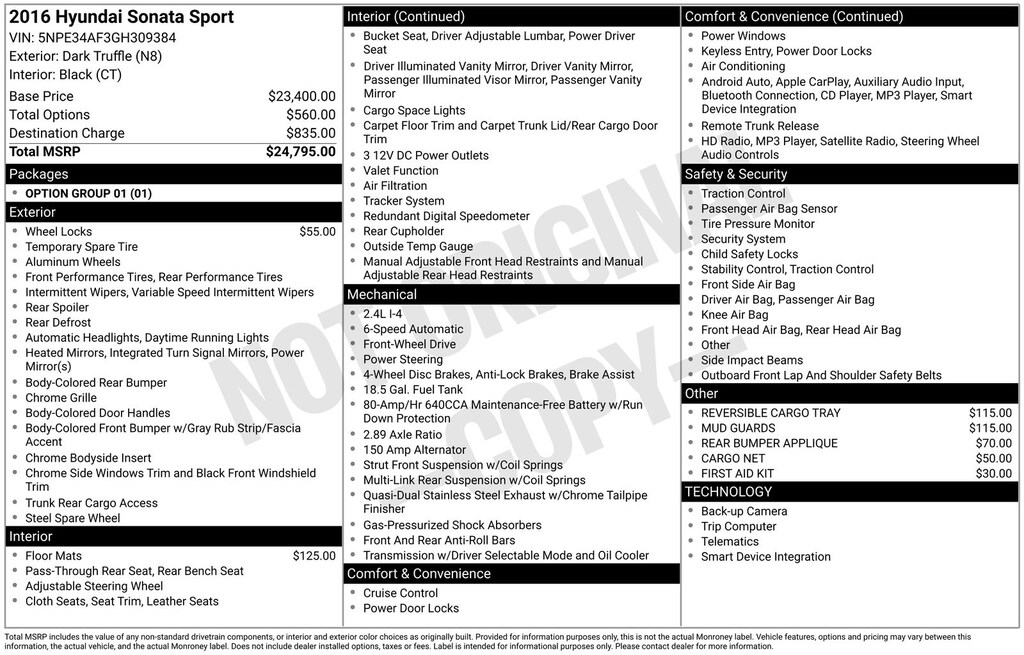 Dark Truffle 2016 Hyundai Sonata Sport FWD 6-Speed Automatic with Shiftronic 2.4L I4 DGI DOHC 16V ULEV II 185hp Black Cloth, Option Group 01.