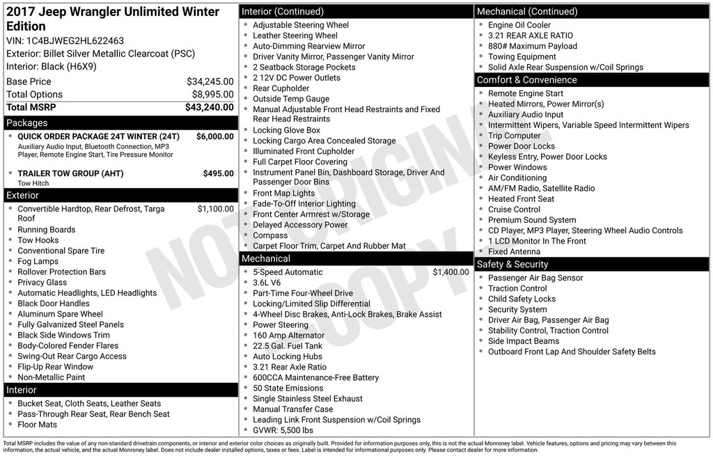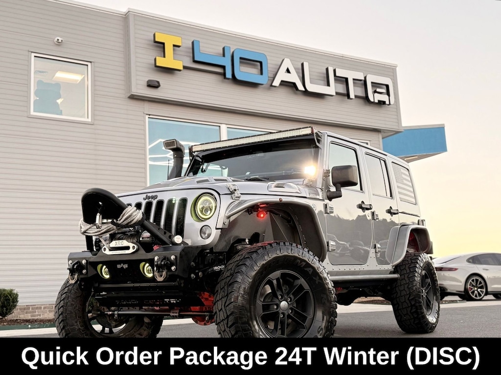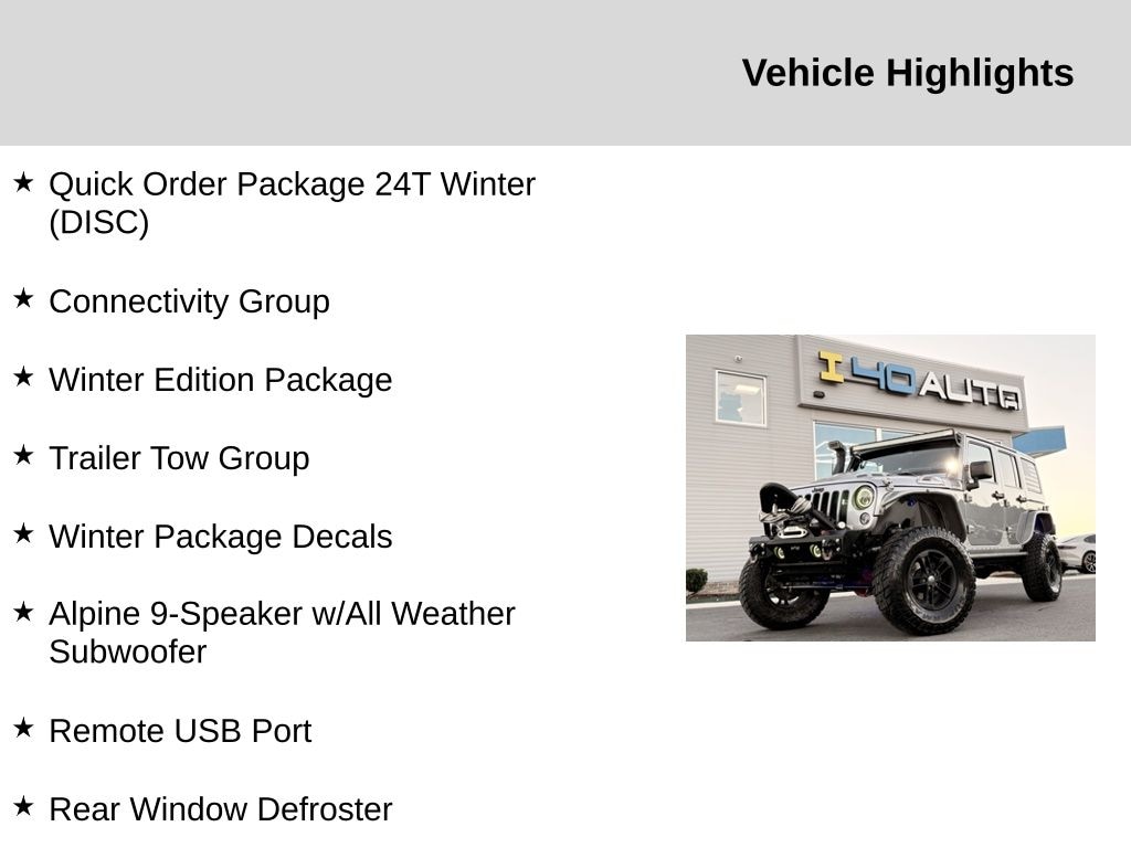 Connectivity Group (Remote USB Port, Tire Pressure Monitoring Display, Uconnect Voice Command w/Bluetooth, and Vehicle Information Center), Quick Order Package 24T Winter (DISC) (Alpine 9-Speaker w/All Weather Subwoofer, Anti-Spin Differential Rear Axle, BF Goodrich Brand Tires, Black 3-Piece Hard Top, Black Fuel Filler Door, Black Jeep Grille Badge, Body Color Grille w/Black Accent, Delete Sahara Badge, Delete Sunrider Soft Top, Diesel Gray Interior Accents, Driver Height Adjuster Seat, Freedom Panel Storage Bag, Front Seat Back Map Pockets, Heated Front Seats, Leather Seat w/Cloth (Sport Mesh) (DISC), Low Gloss Black Wrangler Decal, MOPAR Black Tail Lamp Guards, MOPAR Coat Hooks & Grab Handles, MOPAR HD Rear Bumper, MOPAR Slush Mats, MOPAR Winch-Capable HD Front Bumper, Piano Black Interior Accents, Rear Window Defroster, Rear Window Wiper/Washer, Remote Start System, and Wheels: 17" x 7.5" Sport 5-Spoke Black (DISC)), Trailer Tow Group (Class II Receiver Hitch and Trailer Tow w/4-Pin Connector Wiring), Winter Edition Package, Winter Package Decals, 18" x 7.5" Polished Satin Carbon Wheels, 3.21 Rear Axle Ratio, 4-Wheel Disc Brakes, 8 Speakers, ABS brakes, Air Conditioning, Alloy wheels, AM/FM radio: SiriusXM, Audio Jack Input for Mobile Devices, Auto-dimming Rear-View mirror, Body Color 3-Piece Hard Top, Brake assist, CD player, Cloth Seats w/Adjustable Head Restraints, Compass, Driver door bin, Driver vanity mirror, Dual front impact airbags, Electronic Stability Control, Front anti-roll bar, Front Bucket Seats, Front Center Armrest w/Storage, Front fog lights, Front reading lights, Fully automatic headlights, Heated door mirrors, Heavy Duty Suspension w/Gas Shocks (DISC), Illuminated entry, Integrated roll-over protection, Leather steering wheel, Low tire pressure warning, Occupant sensing airbag, Outside temperature display, Panic alarm, Passenger door bin, Passenger vanity mirror, Power door mirrors, Power steering, Power windows, Radio data system, Radio: 130, Rear anti-roll bar, Remote keyless entry, Security system, Speed control, Split folding rear seat, Steering wheel mounted audio controls, Tachometer, Tilt steering wheel, Traction control, Trip computer, and Variably intermittent wipers. Recent Arrival!
