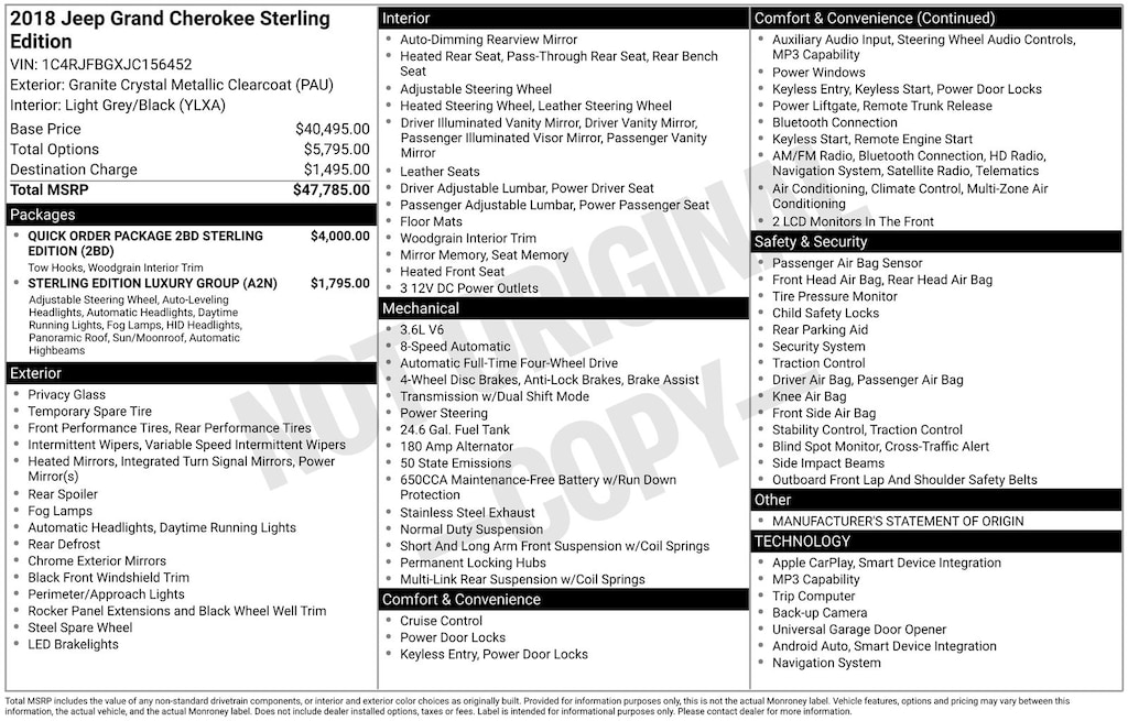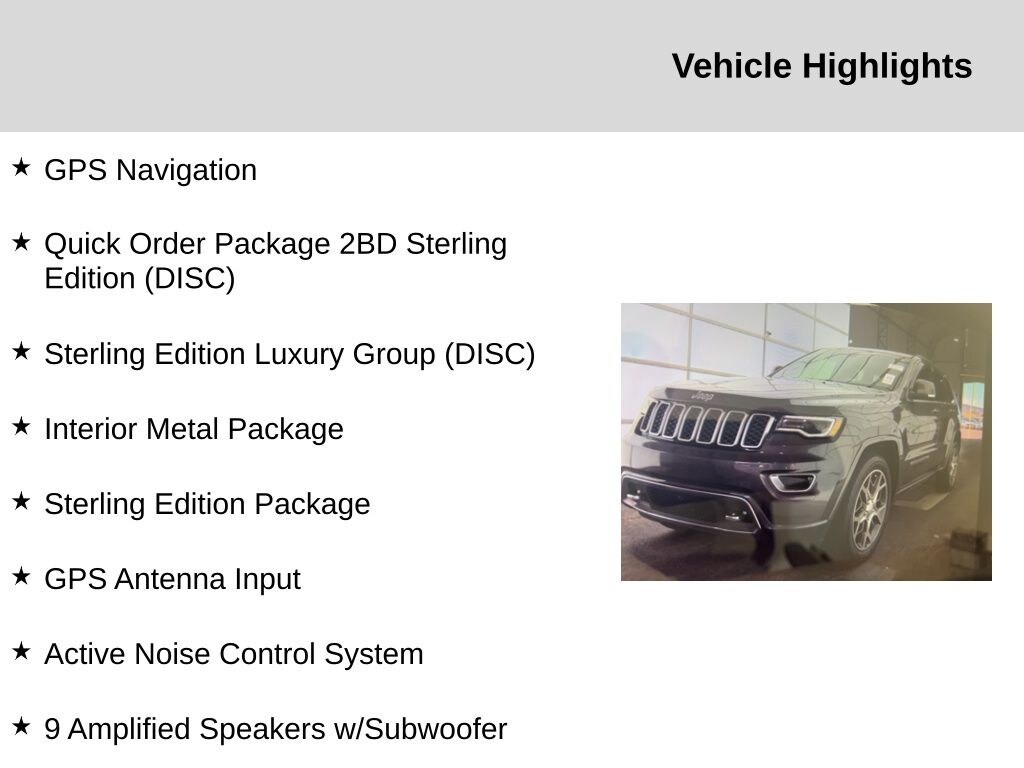 Interior Metal Package (Aluminum Lithograph Shifter Bezel, Aluminum Painted Steering Wheel Bezel, and Instrument Panel Aludiam Linear Bezel), Quick Order Package 2BD Sterling Edition (DISC) (1-Year SiriusXM Guardian Trial, 25th Anniversary Badge, 5-Year SiriusXM Traffic Service, 5-Year SiriusXM Travel Link Service, 506 Watt Amplifier, 8.4" Touchscreen Display, 9 Amplified Speakers w/Subwoofer, Active Noise Control System, Apple CarPlay, Auto-Dimming Exterior Passenger Mirror, Blind Spot & Cross Path Detection, Body Color Claddings, Body Color Door Handles, Body Color Exterior Mirrors, Body Color Fender Flares, Body Color/Platinum Front Fascia, Body Color/Platinum Rear Fascia, Delete Limited Badge, Dual Bright Exhaust Tips, For Details Visit DriveUconnect.com, Gloss Black Grille-Platinum Chrome, Google Android Auto, GPS Antenna Input, GPS Navigation, HD Radio, Integrated Voice Command w/Bluetooth, Leather Wrapped I/P & Center Armrest, Platinum Chrome Front Tow Hooks, Platinum Day Light Opening Moldings, Platinum Exterior Badging, Platinum Side Roof Rails, Platinum Strip Tail Lamp, Power Sunroof (DISC), Radio: Uconnect 4C Nav w/8.4" Display, SiriusXM Traffic Plus, SiriusXM Travel Link, USB Host Flip, and Wheels: 20" x 8.0" Heritage Aluminum (DISC)), Sterling Edition Luxury Group (DISC) (Auto High Beam Headlamp Control, Automatic Headlamp Leveling System, Bi-Xenon High-Intensity Discharge Headlamps, Dual-Pane Panoramic Sunroof, Front LED Fog Lamps, LED Daytime Running Headlamps, and Power Tilt/Telescope Steering Column), Sterling Edition Package, 4WD, 3.45 Rear Axle Ratio, 4-Wheel Disc Brakes, 6 Speakers, ABS brakes, Air Conditioning, Alloy wheels, AM/FM radio: SiriusXM, Anti-whiplash front head restraints, Apple CarPlay/Android Auto, Audio memory, Auto-dimming door mirrors, Auto-dimming Rear-View mirror, Automatic temperature control, Brake assist, Bumpers: body-color, Chrome Exterior Mirrors, Compass, Delay-off headlights, Driver door bin, Driver vanity mirror, Dual front impact airbags, Dual front side impact airbags, Electronic Stability Control, Engine Oil Cooler, Four wheel independent suspension, Front anti-roll bar, Front Bucket Seats, Front Center Armrest w/Storage, Front dual zone A/C, Front fog lights, Front reading lights, Fully automatic headlights, Garage door transmitter, Heated door mirrors, Heated front seats, Heated rear seats, Heated steering wheel, Illuminated entry, Knee airbag, Leather Shift Knob, Leather Trimmed Bucket Seats, Low tire pressure warning, Manufacturer's Statement of Origin, Memory seat, Normal Duty Suspension, Occupant sensing airbag, Outside temperature display, Overhead airbag, Overhead console, Panic alarm, ParkView Rear Back-Up Camera, Passenger door bin, Passenger vanity mirror, Power door mirrors, Power driver seat, Power Liftgate, Power passenger seat, Power steering, Power windows, Radio data system, Radio: Uconnect 4 w/7" Display, Rear anti-roll bar, Rear reading lights, Rear seat center armrest, Rear window defroster, Rear window wiper, Remote keyless entry, Roof rack: rails only, Security system, Speed control, Speed-Sensitive Wipers, Split folding rear seat, Spoiler, Steering wheel mounted audio controls, Tachometer, Telescoping steering wheel, Tilt steering wheel, Traction control, Trip computer, Turn signal indicator mirrors, Variably intermittent wipers, and Wheels: 18" x 8.0" Tech Gray AluminuM. Recent Arrival!