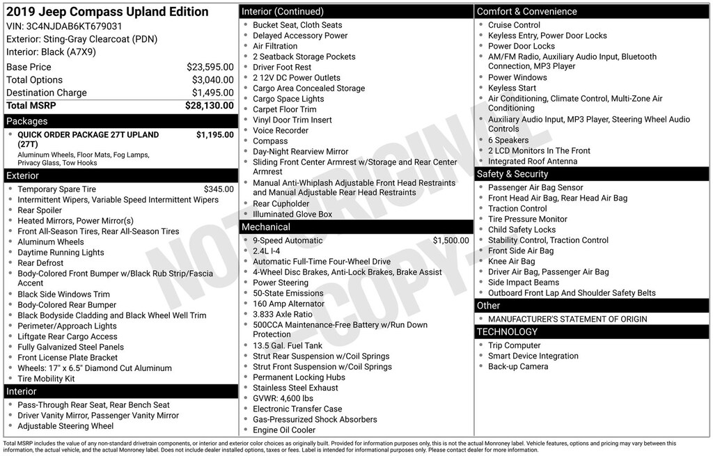 Quick Order Package 27T Upland (DISC) (All-Season Floor Mats, Black 4x4 Tailgate Badge, Black Grille w/Black Rings, Black Side Roof Rails, Black Tow Hooks, Body Color Door Handles, Body Color Exterior Mirrors, Bright Exhaust Tip, Deep Tint Sunscreen Glass, Fog & Cornering Lamps, Gloss Black Compass Badge, Gloss Black Fog Lamp Bezels, Gloss Black Jeep Badge, Gloss Black Lower Rear Fascia Valance, Gloss Black Tow Hook Bezels, Silver Anodized Interior Accents, Upland Edition, Upland Fascias, Upland Suspension, and Wheels: 17" x 6.5" Painted/Bright Aluminum (DISC)), 4WD, 3.833 Axle Ratio, 4-Wheel Disc Brakes, 6 Speakers, ABS brakes, Air Conditioning, AM/FM radio, Anti-whiplash front head restraints, Apple CarPlay/Android Auto, Automatic temperature control, Brake assist, Bumpers: body-color, Cloth Low-Back Bucket Seats, Compass, Delay-off headlights, Driver door bin, Driver vanity mirror, Dual front impact airbags, Dual front side impact airbags, Electronic Stability Control, Four wheel independent suspension, Front anti-roll bar, Front Bucket Seats, Front Center Armrest w/Storage, Front dual zone A/C, Front reading lights, Heated door mirrors, Illuminated entry, Knee airbag, Low tire pressure warning, Manufacturer's Statement of Origin, Occupant sensing airbag, Outside temperature display, Overhead airbag, Overhead console, Panic alarm, ParkView Rear Back-Up Camera, Passenger door bin, Passenger vanity mirror, Power door mirrors, Power steering, Power windows, Radio: Uconnect 4 w/7" Display, Rear anti-roll bar, Rear seat center armrest, Rear window defroster, Rear window wiper, Remote keyless entry, Speed control, Split folding rear seat, Spoiler, Steering wheel mounted audio controls, Tachometer, Telescoping steering wheel, Tilt steering wheel, Traction control, Trip computer, Variably intermittent wipers, and Wheels: 16" x 6.5" Styled Black Steel. Recent Arrival! 22/30 City/Highway MPG