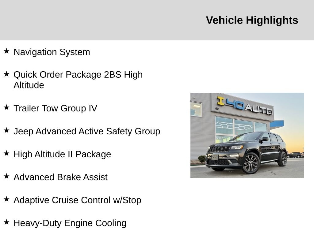 High Altitude II Package, Jeep Advanced Active Safety Group (Adaptive Cruise Control w/Stop, Advanced Brake Assist, Full Speed FWD Collision Warn Plus, Lane Departure Warning Plus, Parallel & Perp Park Assist w/Stop, and Rain Sensitive Windshield Wipers), Quick Order Package 2BS High Altitude (7 & 4 Pin Wiring Harness, Anodized/Light Black Chrome Interior Accents, Black Roof Molding, Black Wood Instrument Panel & Door Spears, Body Color Door Handles, Body Color Exterior Mirrors, Body Color Fascias w/Granite Accents, Body Color Sill Extension, Bright Pedals, Class IV Receiver Hitch, Dark Day Light Opening Moldings, Dark Headlamp Bezel Finish, Dark Lens Taillamps, Dual Dark Chrome Exhaust Tip, Granite Crystal Exterior Accents, Granite Crystal Exterior Badging, Granite Crystal/Black Grille, Heavy-Duty Engine Cooling, Leather Wrapped Steering Wheel, Nappa Leather Trimmed Bucket Seats, Premium Accent Claddings, Premium LED Fog Lamps, and Wheels: 20" x 8.0" Granite Crystal Aluminum), Trailer Tow Group IV, 4WD, 10 Speakers, 19 Speakers High Performance Audio, 3.45 Rear Axle Ratio, 4-Wheel Disc Brakes, 8.4" Touchscreen Display, 825 Watt Amplifier, ABS brakes, Active Noise Control System, Air Conditioning, Alloy wheels, AM/FM radio: SiriusXM, Anti-whiplash front head restraints, Apple CarPlay/Android Auto, Audio memory, Auto High-beam Headlights, Auto-dimming door mirrors, Auto-dimming Rear-View mirror, Auto-leveling suspension, Automatic temperature control, Brake assist, Bumpers: body-color, Compass, Delay-off headlights, Driver door bin, Driver vanity mirror, Dual Bright Exhaust Tips, Dual front impact airbags, Dual front side impact airbags, Electronic Stability Control, Emergency communication system: SiriusXM Guardian, Four wheel independent suspension, Front anti-roll bar, Front Bucket Seats, Front Center Armrest w/Storage, Front dual zone A/C, Front fog lights, Front License Plate Bracket, Front reading lights, Fully automatic headlights, Garage door transmitter, Genuine wood dashboard insert, Heated door mirrors, Heated front seats, Heated rear seats, Heated steering wheel, High intensity discharge headlights: Bi-Xenon, Illuminated entry, Knee airbag, Leather Shift Knob, Leather steering wheel, Leather Trim Seats w/Edge Welting, Low tire pressure warning, Memory seat, Navigation System, Normal Duty Suspension, Occupant sensing airbag, Outside temperature display, Overhead airbag, Overhead console, Panic alarm, ParkView Rear Back-Up Camera, Passenger door bin, Passenger vanity mirror, Power door mirrors, Power driver seat, Power Liftgate, Power moonroof: Dual-Pane Panoramic, Power passenger seat, Power steering, Power windows, Radio data system, Radio: Uconnect 4C Nav w/8.4" Display, Rain sensing wipers, Rear anti-roll bar, Rear reading lights, Rear seat center armrest, Rear window defroster, Rear window wiper, Remote keyless entry, Roof rack: rails only, Security system, Speed control, Speed-sensing steering, Speed-Sensitive Wipers, Split folding rear seat, Spoiler, Steering wheel mounted audio controls, Tachometer, Telescoping steering wheel, Tilt steering wheel, Traction control, Trip computer, Turn signal indicator mirrors, Variably intermittent wipers, Ventilated front seats, Voltmeter, and Wheels: 20" x 8.0" Polished/Tech Gray Aluminum. Recent Arrival!