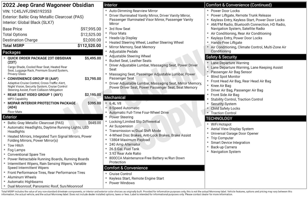 Convenience Group III (Active Driving Assist System, Advanced Security Alert System, Interior Rear Facing Camera, Intersection Collision Assist System, and Night Vision/Pedestrian-Animal Detection), MOPAR Interior Protection Package (All-Season Floor Mats and Cargo Tray), Obsidian Appearance Package, Quick Order Package 23T Obsidian (23 Speaker McIntosh Reference Audio System, Adjustable Roof Rail Crossbars, Black Interior Accents, Black Roof, Cargo Cover, Front Console Cooler, Front Passenger Interactive Display, Gloss Black Upper & Lower DLO Molding, Piano Black Exterior Accents, Premium Tinted Glass, Ventilated Rear Seats, and Wheels: 22" x 9.0" Tinted Polished w/Black Insert), Rear Seat Video Group 1 (Amazon Fire TV Built-In, Seatback Video Screens, and Video USB Port), Two Tone Paint Group, 19 Speakers, 3.92 Rear Axle Ratio, 3rd row seats: bench, 4-Wheel Disc Brakes, ABS brakes, Adjustable pedals, Air Conditioning, Alloy wheels, AM/FM radio: SiriusXM with 360L, Anti-whiplash front head restraints, Audio memory, Auto High-beam Headlights, Auto-dimming door mirrors, Auto-dimming Rear-View mirror, Auto-leveling suspension, Automatic temperature control, Brake assist, Bumpers: body-color, Compass, Delay-off headlights, Driver door bin, Driver vanity mirror, Driver's Seat Mounted Armrest, Dual front impact airbags, Dual front side impact airbags, Electronic Stability Control, Four wheel independent suspension, Front anti-roll bar, Front Bucket Seats, Front Center Armrest w/Storage, Front dual zone A/C, Front fog lights, Front reading lights, Fully automatic headlights, Garage door transmitter, Genuine wood console insert, Genuine wood dashboard insert, Genuine wood door panel insert, Heads-Up Display, Heated door mirrors, Heated front seats, Heated rear seats, Heated steering wheel, Illuminated entry, Knee airbag, Leather steering wheel, Leather Trimmed Bucket Seats, Low tire pressure warning, Memory seat, Navigation System, Normal Duty Suspension, Occupant sensing airbag, Outside temperature display, Overhead airbag, Overhead console, Panic alarm, Passenger door bin, Passenger seat mounted armrest, Passenger vanity mirror, Pedal memory, Power adjustable front head restraints, Power door mirrors, Power driver seat, Power Liftgate, Power moonroof, Power passenger seat, Power steering, Power windows, Radio data system, Radio: Uconnect 5 Nav w/12.0" Display, Rain sensing wipers, Rear air conditioning, Rear anti-roll bar, Rear dual zone A/C, Rear reading lights, Rear seat center armrest, Rear window defroster, Rear window wiper, Reclining 3rd row seat, Remote keyless entry, Security system, Speed control, Speed-sensing steering, Speed-Sensitive Wipers, Split folding rear seat, Steering wheel memory, Steering wheel mounted audio controls, Tachometer, Telescoping steering wheel, Tilt steering wheel, Traction control, Trip computer, Turn signal indicator mirrors, Variably intermittent wipers, Ventilated front seats, Voltmeter, and Wheels: 22" x 9.0" Premium 1 Aluminum. Recent Arrival!