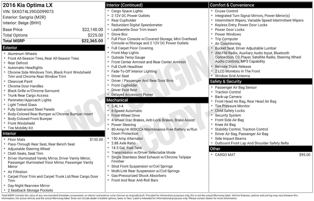 Sangria 2016 Kia Optima LX FWD 6-Speed Automatic with Sportmatic 2.4L I4 DGI DOHC Beige Cloth.