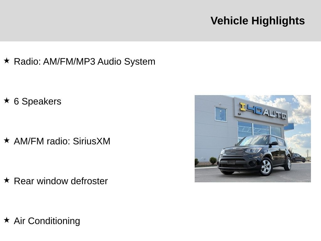 Shadow Black 2018 Kia Soul FWD 6-Speed Automatic with Sportmatic I4 6 Speakers, Air Conditioning, AM/FM radio: SiriusXM, Radio: AM/FM/MP3 Audio System, Rear window defroster.