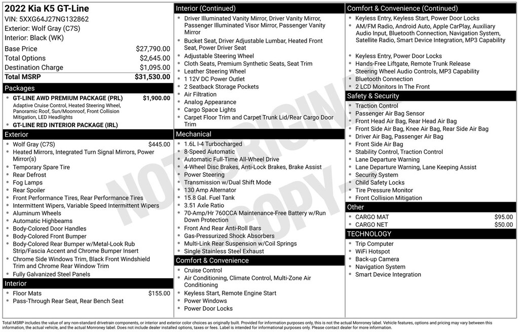 Wolf Gray 2022 Kia K5 GT-Line AWD 8-Speed Automatic I4 Forward Collision Avoidance-Assist - Cyclist, Forward Collision Avoidance-Assist - Junction Turn, Gloss Black Pillar & Door Frame Cover, GT-Line AWD Premium Package, GT-Line Red Interior Package, Heated Steering Wheel, Highway Driving Assist, LED Interior Lighting, LED Projection Headlights, Navigation System, Navigation-Based Smart Cruise Control - Curve, Panoramic Sunroof, Smart Cruise Control w/Stop & Go.