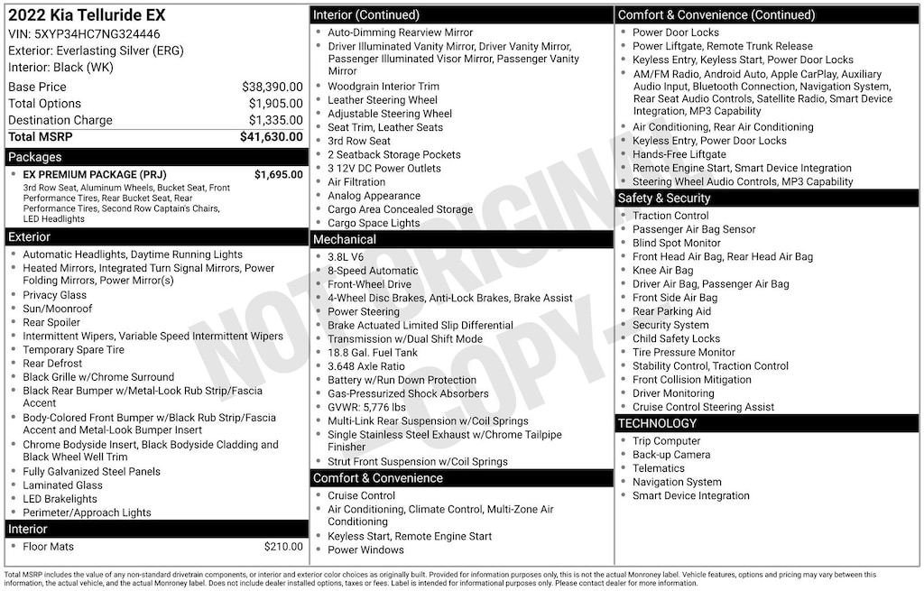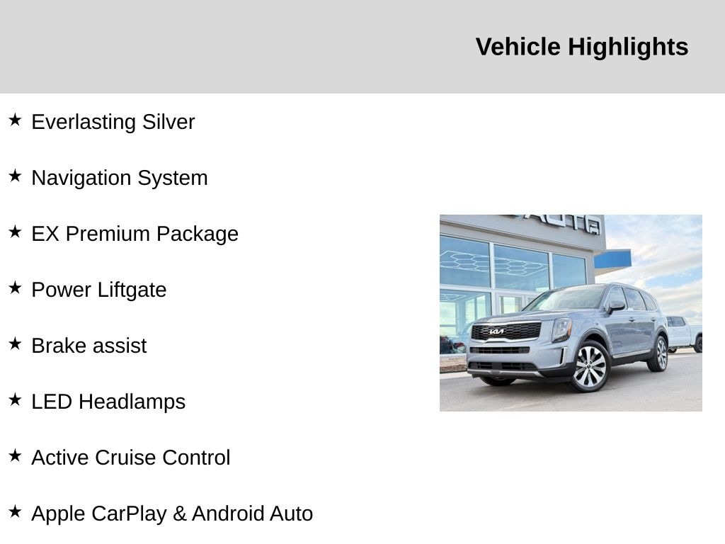 Everlasting Silver 2022 Kia Telluride EX FWD 8-Speed Automatic 3.8L V6 DOHC Everlasting Silver, 20" x 7.5" Machined Alloy Wheels, 2nd Row Captain Chairs, Active Cruise Control, Apple CarPlay & Android Auto, Brake assist, EX Premium Package, LED Headlamps, Navigation System, Power Liftgate, Satin Chrome Roof Rails.