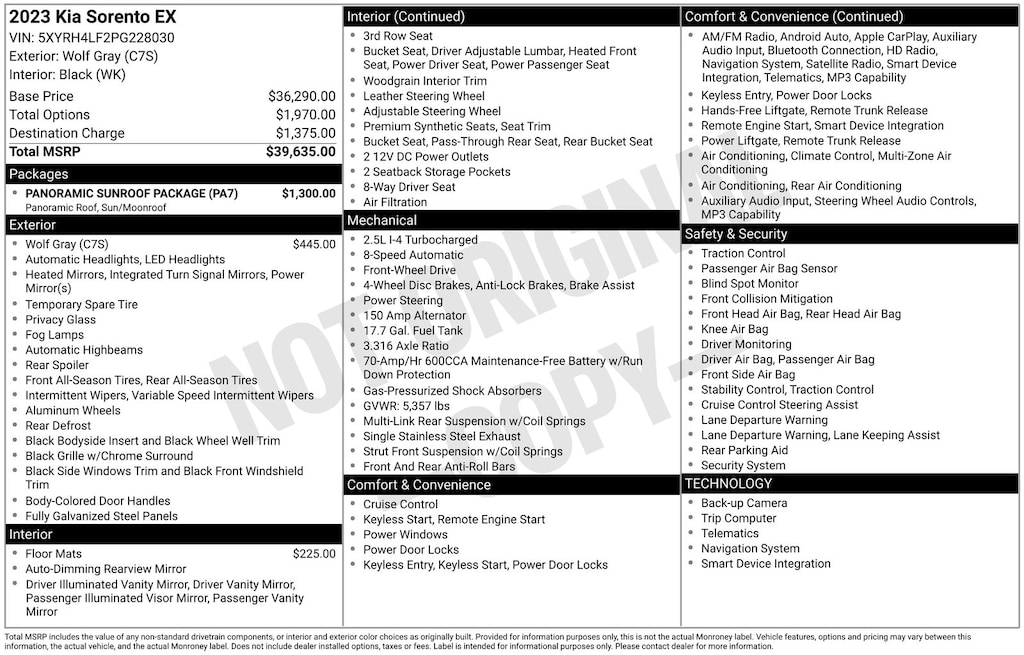 Wolf Gray 2023 Kia Sorento EX FWD 8-Speed DCT 2.5L I4 DGI Turbocharged DOHC 16V LEV3-ULEV70 281hp 6 Speakers, AM/FM radio: SiriusXM, Bumpers: body-color, Heated door mirrors, LED Interior Lighting, Navigation System, Panoramic Power Sunroof w/Power Sunshade, Panoramic Sunroof Package, Radio data system, Radio: AM/FM Audio System.