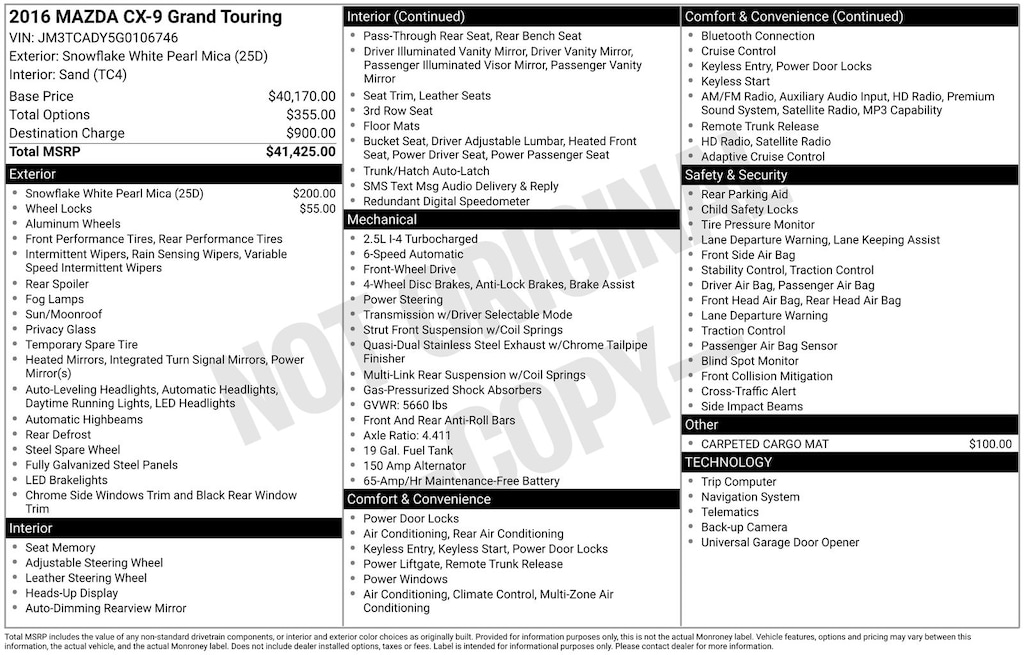 12 Speakers, 3rd row seats: bench, 4-Wheel Disc Brakes, ABS brakes, Aha Internet Radio, Air Conditioning, Alloy wheels, AM/FM radio: SiriusXM, Auto High-beam Headlights, Auto-dimming Rear-View mirror, Automatic temperature control, Axle Ratio: 4.411, Brake assist, Bumpers: body-color, Carpeted Cargo Mat, Compass, Delay-off headlights, Driver door bin, Driver vanity mirror, Dual front impact airbags, Dual front side impact airbags, E911 Automatic Emergency Notification, Electronic Stability Control, Emergency communication system: Mazda Connect, Exterior Parking Camera Rear, Four wheel independent suspension, Front anti-roll bar, Front Bucket Seats, Front Center Armrest, Front dual zone A/C, Front fog lights, Front reading lights, Fully automatic headlights, Garage door transmitter: HomeLink, Heads-Up Display, Heated door mirrors, Heated Front Bucket Seats, Heated front seats, Illuminated entry, Infotainment System Voice Command, Lane Departure Warning System, Leather Shift Knob, Leather steering wheel, Leather Trimmed Seats, Low tire pressure warning, Memory seat, Navigation System, Occupant sensing airbag, Outside temperature display, Overhead airbag, Overhead console, Pandora Internet Radio, Panic alarm, Passenger door bin, Passenger vanity mirror, Power door mirrors, Power driver seat, Power Liftgate, Power moonroof, Power passenger seat, Power steering, Power windows, Radio Broadcast Data System Program Information, Radio data system, Radio: AM/FM Sound System w/Bose Audio, Rain sensing wipers, Rear air conditioning, Rear anti-roll bar, Rear Parking Sensors, Rear seat center armrest, Rear window defroster, Rear window wiper, Remote keyless entry, Roof rack: rails only, SIRIUSXM Satellite Radio, SMS Text Msg Audio Delivery & Reply, Speed control, Speed-sensing steering, Split folding rear seat, Spoiler, Steering wheel mounted audio controls, Stitcher Internet Radio, Tachometer, Telescoping steering wheel, Tilt steering wheel, Traction control, Trip computer, Turn signal indicator mirrors, Variably intermittent wipers, Wheel Locks, and Wheels: 20" x 8.5J Aluminum Alloy. Recent Arrival! 22/28 City/Highway MPG