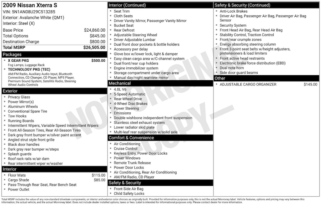 Avalanche Clearcoat 2009 Nissan Xterra S RWD 5-Speed Automatic 4.0L V6 DOHC 24V