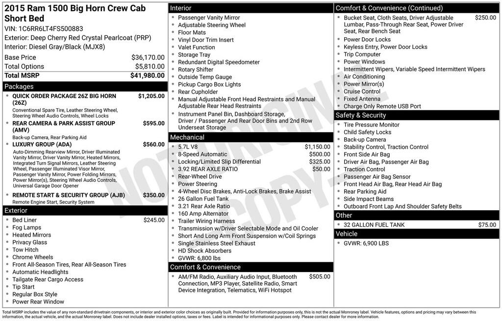 Deep Cherry Red Crystal Pearlcoat 2015 Ram 1500 Big Horn RWD 8-Speed Automatic HEMI 5.7L V8 Multi Displacement VVT