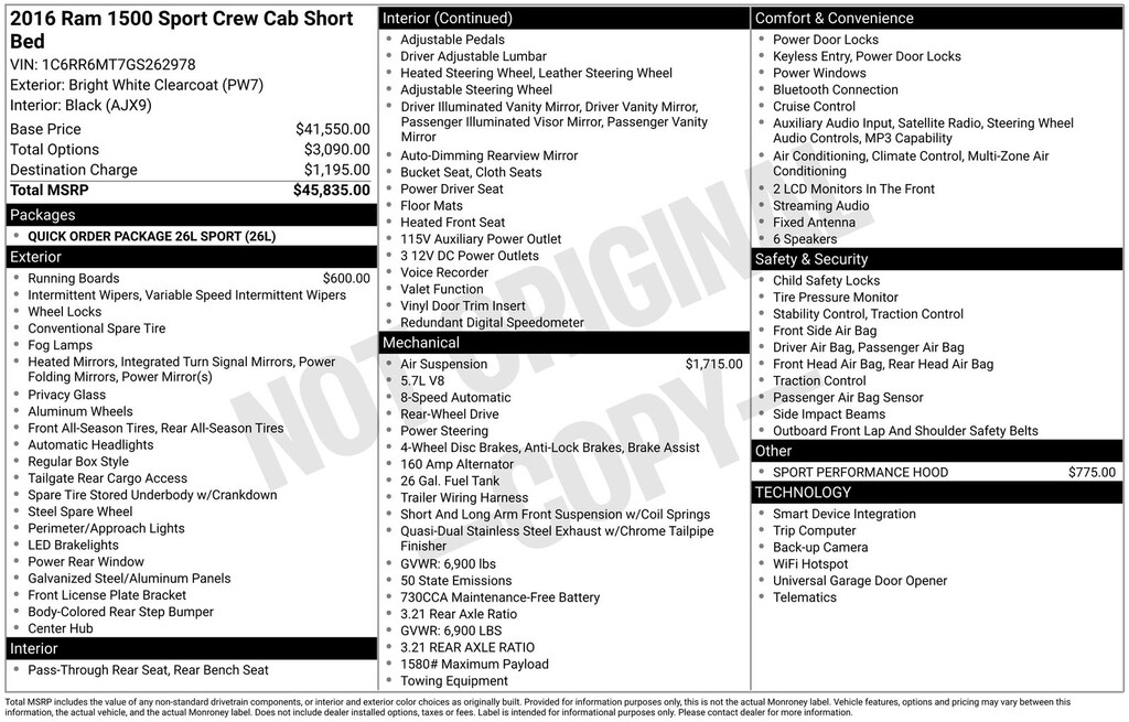 Quick Order Package 26L Sport, 115V Auxiliary Power Outlet, 20" x 9" Polished Aluminum Wheels, 3.21 Rear Axle Ratio, 4-Corner Air Suspension, 4-Wheel Disc Brakes, 6 Speakers, ABS brakes, Adjustable pedals, Air Conditioning, Alloy wheels, AM/FM radio, Auto-dimming door mirrors, Auto-dimming Rear-View mirror, Automatic temperature control, Brake assist, Bucket Seats, Bumpers: body-color, Center Hub, Cloth Bucket Seats, Compass, Delay-off headlights, Driver door bin, Driver vanity mirror, Dual front impact airbags, Dual front side impact airbags, Electronic Stability Control, Emergency communication system: Uconnect Access, Folding Flat Load Floor Storage, Front anti-roll bar, Front Bucket Seats, Front Center Armrest w/Storage, Front dual zone A/C, Front fog lights, Front reading lights, Front wheel independent suspension, Full Length Upgraded Floor Console, Fully automatic headlights, Garage door transmitter, Heated door mirrors, Heated front seats, Heated steering wheel, High Back Seats, Illuminated entry, Leather steering wheel, Low tire pressure warning, Occupant sensing airbag, Outside temperature display, Overhead airbag, Overhead console, Panic alarm, ParkView Rear Back-Up Camera, Passenger door bin, Passenger vanity mirror, Power door mirrors, Power driver seat, Power Lumbar Adjust, Power steering, Power windows, Radio data system, Radio: Uconnect 8.4, Rear 60/40 Split Folding Seat, Rear anti-roll bar, Rear seat center armrest, Rear step bumper, Remote keyless entry, Speed control, Split folding rear seat, Sport Performance Hood, Steering wheel mounted audio controls, Tachometer, Tilt steering wheel, Traction control, Trip computer, Turn signal indicator mirrors, Variably intermittent wipers, Voltmeter, and Wheel to Wheel Side Steps. Recent Arrival!