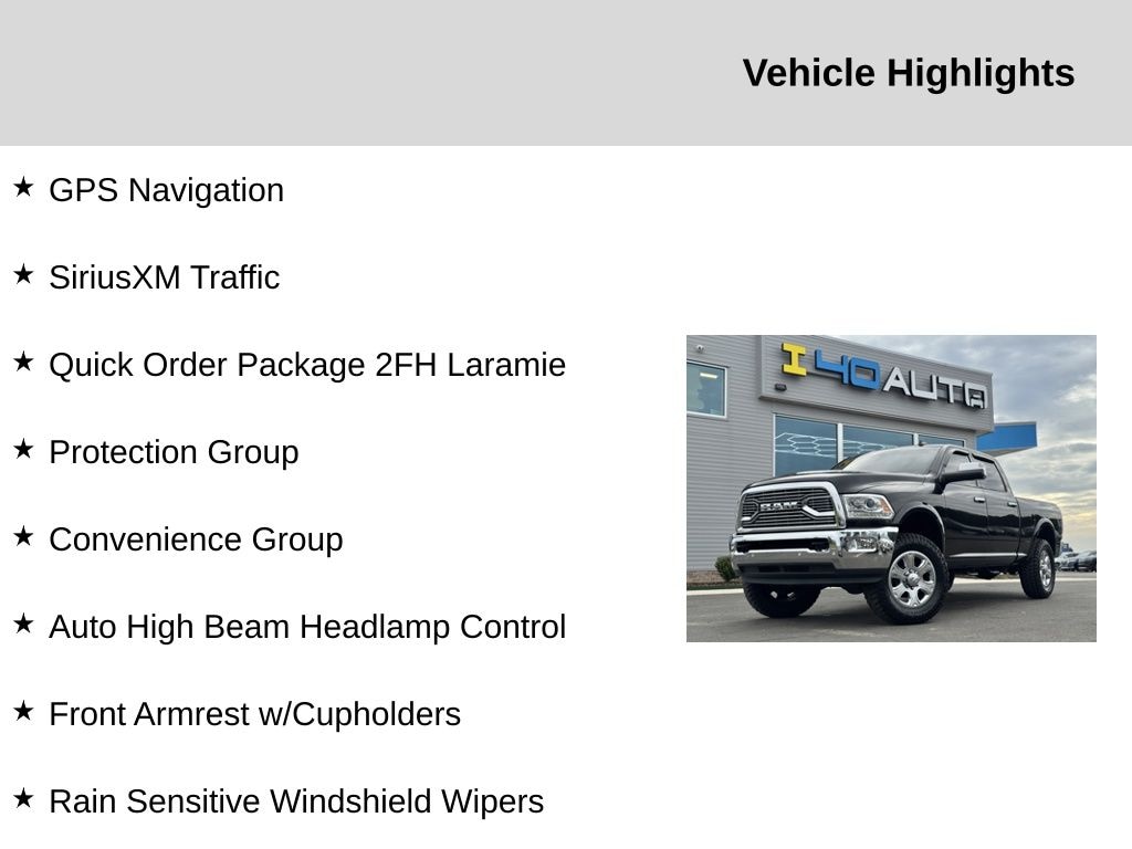 Convenience Group (Auto High Beam Headlamp Control and Rain Sensitive Windshield Wipers), Protection Group, Quick Order Package 2FH Laramie (Front Armrest w/Cupholders), GPS Navigation, SiriusXM Traffic, 1 Year Trial (Registration Required), 10 Speakers, 115V Auxiliary Power Outlet, 220 Amp Alternator, 3.42 Axle Ratio, 3.73 Axle Ratio, 4-Wheel Disc Brakes, 5-Year SiriusXM Traffic Service, 5-Year SiriusXM Travel Link Service, 5th Wheel/Gooseneck Towing Prep Group, 8.4" Touchscreen Display, ABS brakes, Air Conditioning, Air Conditioning ATC w/Dual Zone Control, Alloy wheels, AM/FM radio: SiriusXM, Anti-Spin Differential Rear Axle, Audio memory, Auto Level Rear Air Suspension, Auto-dimming door mirrors, Auto-dimming Rear-View mirror, Automatic temperature control, Brake assist, Bumpers: chrome, Center Hub, Chrome Exterior Mirrors, Compass, CTR Stop Lamp w/Cargo View Camera, Delay-off headlights, Driver door bin, Driver vanity mirror, Dual front impact airbags, Dual front side impact airbags, Electronic Stability Control, Emergency communication system: Uconnect Access, Exterior Mirrors Courtesy Lamps, Exterior Mirrors w/Heating Element, Exterior Mirrors w/Memory, Exterior Mirrors w/Supplemental Signals, For Details Visit DriveUconnect.com, Front anti-roll bar, Front Center Armrest w/Storage, Front dual zone A/C, Front fog lights, Front reading lights, Fully automatic headlights, Garage door transmitter, GPS Antenna Input, HD Radio, Heated door mirrors, Heated Front Seats, Heated front seats, Heated steering wheel, Illuminated entry, Integrated Voice Command w/Bluetooth, Keyless Enter-N-Go, Leather steering wheel, Leather Trim 40/20/40 Bench Seat, LED Bed Lighting, Low tire pressure warning, Manufacturer's Statement of Origin, Media Hub (2 USB, AUX), Media Hub (USB, AUX), Memory seat, Occupant sensing airbag, Outside temperature display, Overhead airbag, Overhead console, Panic alarm, ParkView Rear Back-Up Camera, Passenger door bin, Passenger vanity mirror, Power Adjustable Pedals w/Memory, Power door mirrors, Power driver seat, Power Folding Chrome Trailer Tow Mirrors, Power Folding Mirrors, Power passenger seat, Power steering, Power windows, Radio data system, Radio: Uconnect 3C Nav w/8.4" Display, Radio: Uconnect 3C w/8.4" Display, Radio/Driver Seat/Mirrors/Pedals Memory, Rear seat center armrest, Rear step bumper, Remote keyless entry, Remote Proximity Keyless Entry, Remote Start System, Security system, SiriusXM Satellite Radio, SiriusXM Travel Link, Speed control, Split folding rear seat, Spray In Bedliner, Steering wheel mounted audio controls, Tachometer, Tilt steering wheel, Traction control, Trailer Tow Mirrors, Trip computer, Turn signal indicator mirrors, Uconnect Access, Variably intermittent wipers, Vendor Painted Cargo Box Tracking, Ventilated front seats, Voltmeter, Wheels: 18" x 8.0" Polished Aluminum, and Wheels: 20" x 8.0" Painted Aluminum w/Chrome InsertS. Recent Arrival! Odometer is 14987 miles below market average!