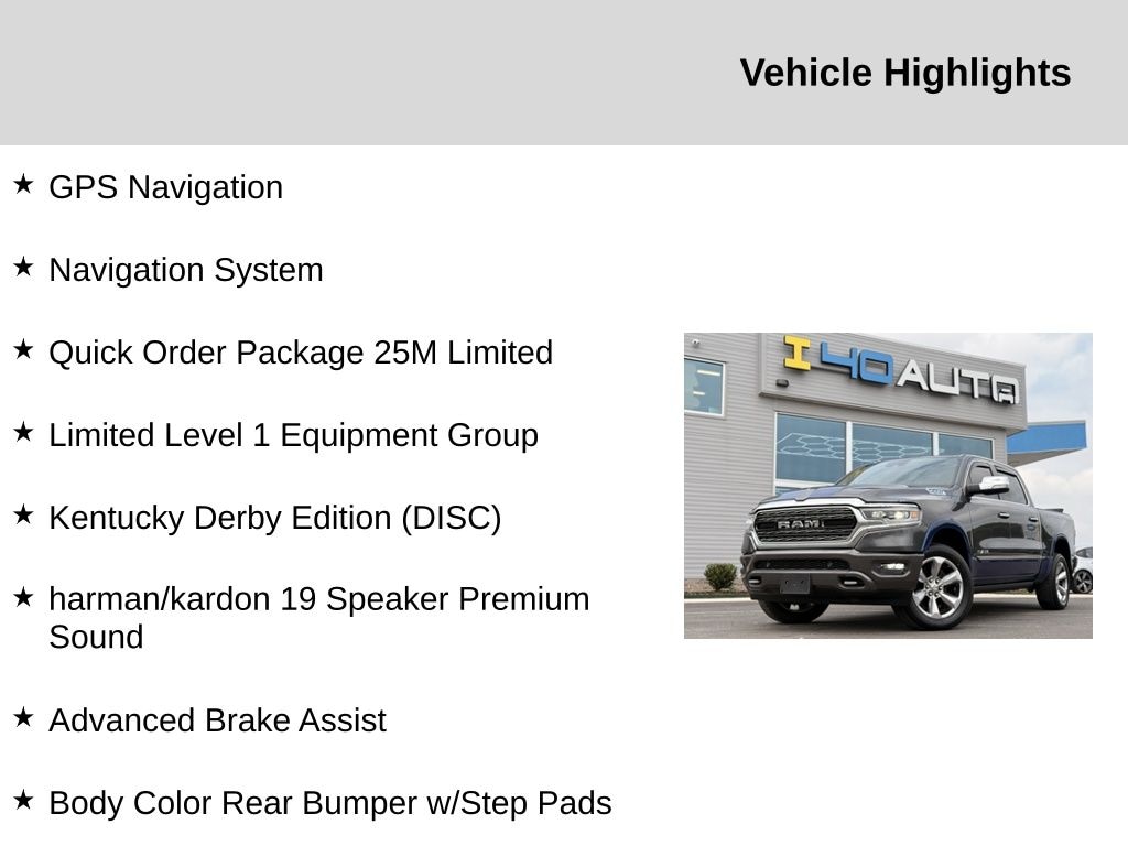 Kentucky Derby Edition (DISC) (Body Color Front Bumper, Body Color Rear Bumper w/Step Pads, and Kentucky Derby Edition Decal), Limited Level 1 Equipment Group, Quick Order Package 25M Limited, 1-Yr SiriusXM Guardian Trial, 10 Speakers, 12" Touchscreen Display, 3.21 Rear Axle Ratio, 4-Wheel Disc Brakes, 48V Belt Starter Generator, ABS brakes, Adjustable pedals, Air Conditioning, Alloy wheels, AM/FM radio: SiriusXM with 360L, Anti-Spin Differential Rear Axle, Apple CarPlay, Apple CarPlay/Android Auto, Audio memory, Auto High-beam Headlights, Auto-dimming door mirrors, Auto-dimming Rear-View mirror, Auto-leveling suspension, Automatic temperature control, Bodyside moldings, Brake assist, Bumpers: chrome, Compass, Delay-off headlights, Disassociated Touchscreen Display, Driver door bin, Driver vanity mirror, Dual front impact airbags, Dual front side impact airbags, Electronic Stability Control, Emergency communication system: SiriusXM Guardian, Front anti-roll bar, Front Bucket Seats, Front Center Armrest w/Storage, Front dual zone A/C, Front fog lights, Front reading lights, Front wheel independent suspension, Fully automatic headlights, Garage door transmitter, Genuine wood console insert, Genuine wood dashboard insert, Genuine wood door panel insert, Google Android Auto, GPS Antenna Input, GPS Navigation, HD Radio, Heated door mirrors, Heated front seats, Heated rear seats, Heated steering wheel, Illuminated entry, Integrated Center Stack Radio, Leather steering wheel, Low tire pressure warning, Memory seat, Navigation System, Occupant sensing airbag, Outside temperature display, Overhead airbag, Overhead console, Panic alarm, ParkView Rear Back-Up Camera, Passenger door bin, Passenger vanity mirror, Pedal memory, Power door mirrors, Power driver seat, Power passenger seat, Power steering, Power windows, Premium Leather Trimmed Bucket Seats, Radio data system, Radio: Uconnect 12 w/Navigation, Rain sensing wipers, Rear anti-roll bar, Rear seat center armrest, Rear step bumper, Rear window defroster, Remote CD player, Remote keyless entry, Security system, SiriusXM Satellite Radio, SiriusXM Traffic Plus, SiriusXM Travel Link, SiriusXM w/360L, Speed control, Split folding rear seat, Steering wheel mounted audio controls, Tachometer, Telescoping steering wheel, Tilt steering wheel, Traction control, Trip computer, Turn signal indicator mirrors, USB Host Flip, Variably intermittent wipers, Ventilated front seats, Voltmeter, and Wheels: 20" x 9" Polished w/Inserts. Recent Arrival!
