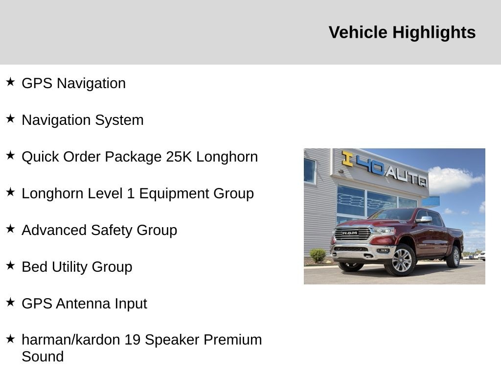 Advanced Safety Group, Bed Utility Group, Longhorn Level 1 Equipment Group (1-Yr SiriusXM Guardian Trial, 12" Touchscreen Display, Apple CarPlay, Disassociated Touchscreen Display, Google Android Auto, GPS Antenna Input, GPS Navigation, HD Radio, Integrated Center Stack Radio, No Satellite Coverage w/HI/AK/PR/VI/GU, Radio: Uconnect 12 w/Navigation, SiriusXM Satellite Radio, SiriusXM Traffic Plus, SiriusXM Travel Link, and SiriusXM w/360L), Quick Order Package 25K Longhorn, #1 Seat Foam Cushion, 10 Speakers, 3 Rear Seat Head Restraints, 3.21 Rear Axle Ratio, 33 Gallon Fuel Tank, 4 Way Front Headrests, 4-Corner Air Suspension, 4-Wheel Disc Brakes, 48V Belt Starter Generator, ABS brakes, Adjustable pedals, Air Conditioning, Alloy wheels, AM/FM radio: SiriusXM, Anti-Spin Differential Rear Axle, Apple CarPlay/Android Auto, Audio memory, Auto High-beam Headlights, Auto-dimming door mirrors, Auto-dimming Rear-View mirror, Automatic temperature control, Brake assist, Bucket Seats, Bumpers: chrome, Compass, Delay-off headlights, Driver door bin, Driver Seat Memory, Driver vanity mirror, Dual front impact airbags, Dual front side impact airbags, Electronic Stability Control, Emergency communication system: SiriusXM Guardian, Front anti-roll bar, Front Bucket Seats, Front Center Armrest w/Storage, Front dual zone A/C, Front fog lights, Front reading lights, Front Seat Back Map Pockets, Front wheel independent suspension, Fully automatic headlights, Garage door transmitter, Genuine wood console insert, Genuine wood dashboard insert, Genuine wood door panel insert, Heated door mirrors, Heated Front Seats, Heated front seats, Heated rear seats, Heated Second Row Seats, Heated Steering Wheel, Heated steering wheel, Illuminated entry, Leather steering wheel, Low tire pressure warning, Memory seat, Navigation System, Occupant sensing airbag, Outside temperature display, Overhead airbag, Overhead console, Panic alarm, ParkView Rear Back-Up Camera, Passenger door bin, Passenger vanity mirror, Pedal memory, Power 4-Way Driver Lumbar Adjust, Power 4-Way Passenger Lumbar Adjust, Power 8-Way Driver & Passenger Seats, Power door mirrors, Power driver seat, Power passenger seat, Power steering, Power windows, Premium Leather Seats w/Filigree, Radio data system, Radio: Uconnect 4C Nav w/8.4" Display, Rain sensing wipers, RamBox Cargo Management System, Rear 60/40 Folding Split Recline Seat, Rear anti-roll bar, Rear seat center armrest, Rear step bumper, Rear window defroster, Remote CD player, Remote keyless entry, Security system, Speed control, Split folding rear seat, Steering wheel mounted audio controls, Tachometer, Telescoping steering wheel, Tilt steering wheel, Traction control, Trailer Brake Control, Trip computer, Turn signal indicator mirrors, Variably intermittent wipers, Ventilated Front Seats, Ventilated front seats, Voltmeter, and Wheels: 20" x 9" Aluminum Painted/Polished. Recent Arrival!