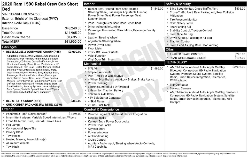 Let's discuss how we can put you behind the wheel of this remarkable 2020 Ram 1500 Rebel. I'm confident that once you experience its capabilities and premium amenities, you'll be eager to make it your own. We look forward to the opportunity to earn your business and help you find the perfect vehicle to meet your needs.