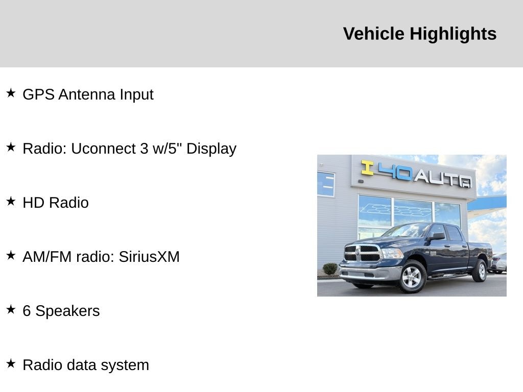 17" x 7" Aluminum Wheels, 3.21 Rear Axle Ratio, 4-Wheel Disc Brakes, 40/20/40 Split Bench Seat, 6 Speakers, ABS brakes, Air Conditioning, Alloy wheels, AM/FM radio: SiriusXM, Black Exterior Mirrors, Brake assist, Bumpers: chrome, Cloth 40/20/40 Bench Seat (Fleet), Compass, Delay-off headlights, Driver door bin, Dual front impact airbags, Dual front side impact airbags, Electronic Stability Control, Exterior Mirrors w/Heating Element, Front anti-roll bar, Front Armrest w/3 Cupholders, Front Center Armrest w/Storage, Front License Plate Bracket, Front reading lights, Front wheel independent suspension, Fully automatic headlights, GPS Antenna Input, Heated door mirrors, Illuminated entry, Integrated Voice Command w/Bluetooth, Low tire pressure warning, Manufacturer's Statement of Origin, Occupant sensing airbag, Outside temperature display, Overhead airbag, Overhead console, Panic alarm, ParkView Rear Back-Up Camera, Passenger door bin, Passenger vanity mirror, Power door mirrors, Power steering, Power windows, Radio data system, Radio: Uconnect 3 w/5" Display, Rear anti-roll bar, Rear Floor Mats, Rear seat center armrest, Rear step bumper, Remote keyless entry, Remote USB Port - Charge Only, Speed control, Storage Tray, Tachometer, Tilt steering wheel, Traction control, Trip computer, Variably intermittent wipers, and Voltmeter. Recent Arrival!