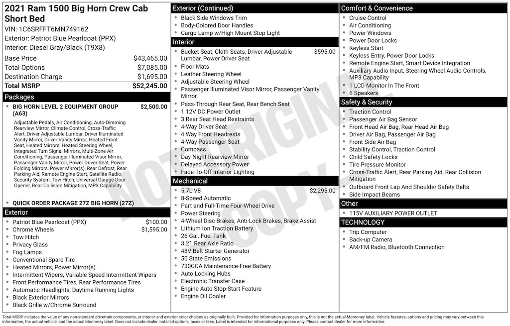 Big Horn Level 2 Equipment Group (115V Auxiliary Power Outlet, 115V Auxiliary Rear Power Outlet, 2nd Row In Floor Storage Bins, 400W Inverter, Air Conditioning ATC w/Dual Zone Control, Auto-Dimming Exterior Driver Mirror, Auto-Dimming Rear-View Mirror, Black Premium Power Mirrors, Class IV Receiver Hitch, Cluster 7.0" TFT Color Display, Exterior Mirrors Courtesy Lamps, Exterior Mirrors w/Supplemental Signals, Foam Bottle Insert (Door Trim Panel), For More Info, Call 800-643-2112, Glove Box Lamp, Heated Front Seats, Heated Steering Wheel, Media Hub w/2 Charge Only USBs, ParkSense Front/Rear Park Assist w/Stop, Power 4-Way Driver Lumbar Adjust, Power 8-Way Driver Seat, Power Adjustable Pedals, Power-Folding Mirrors, Rear Dome w/On/Off Switch Lamp, Rear Power Sliding Window, Rear Window Defroster, Security Alarm, SiriusXM Radio Service, Sun Visors w/Illuminated Vanity Mirrors, and Universal Garage Door Opener), Quick Order Package 27Z Big Horn (Big Horn Badge), 3 Rear Seat Head Restraints, 3.21 Rear Axle Ratio, 4 Way Front Headrests, 4-Wheel Disc Brakes, 40/20/40 Split Bench Seat, 48V Belt Starter Generator, 6 Speakers, ABS brakes, Air Conditioning, Alloy wheels, AM/FM radio, Black Exterior Mirrors, Brake assist, Bumpers: chrome, Cloth Bench Seat, Compass, Delay-off headlights, Driver door bin, Dual front impact airbags, Dual front side impact airbags, Electronic Stability Control, Front anti-roll bar, Front Center Armrest w/Storage, Front fog lights, Front reading lights, Front Seat Back Map Pockets, Front wheel independent suspension, Fully automatic headlights, GPS Antenna Input, Heated door mirrors, Illuminated entry, Integrated Voice Command w/Bluetooth, Leather steering wheel, Low tire pressure warning, Occupant sensing airbag, Outside temperature display, Overhead airbag, Overhead console, Panic alarm, ParkView Rear Back-Up Camera, Passenger door bin, Passenger vanity mirror, Power door mirrors, Power steering, Power windows, Radio data system, Radio: Uconnect 3 w/5" Display, Radio: Uconnect 4 w/8.4" Display, Rear 60/40 Folding Seat, Rear anti-roll bar, Rear seat center armrest, Rear step bumper, Remote keyless entry, Remote Start System, Speed control, Split folding rear seat, Steering wheel mounted audio controls, Tachometer, Telescoping steering wheel, Tilt steering wheel, Traction control, Trip computer, Variably intermittent wipers, Voltmeter, Wheels: 18" x 8" Cast-Aluminum Painted, and Wheels: 20" x 9" Aluminum Chrome Clad.